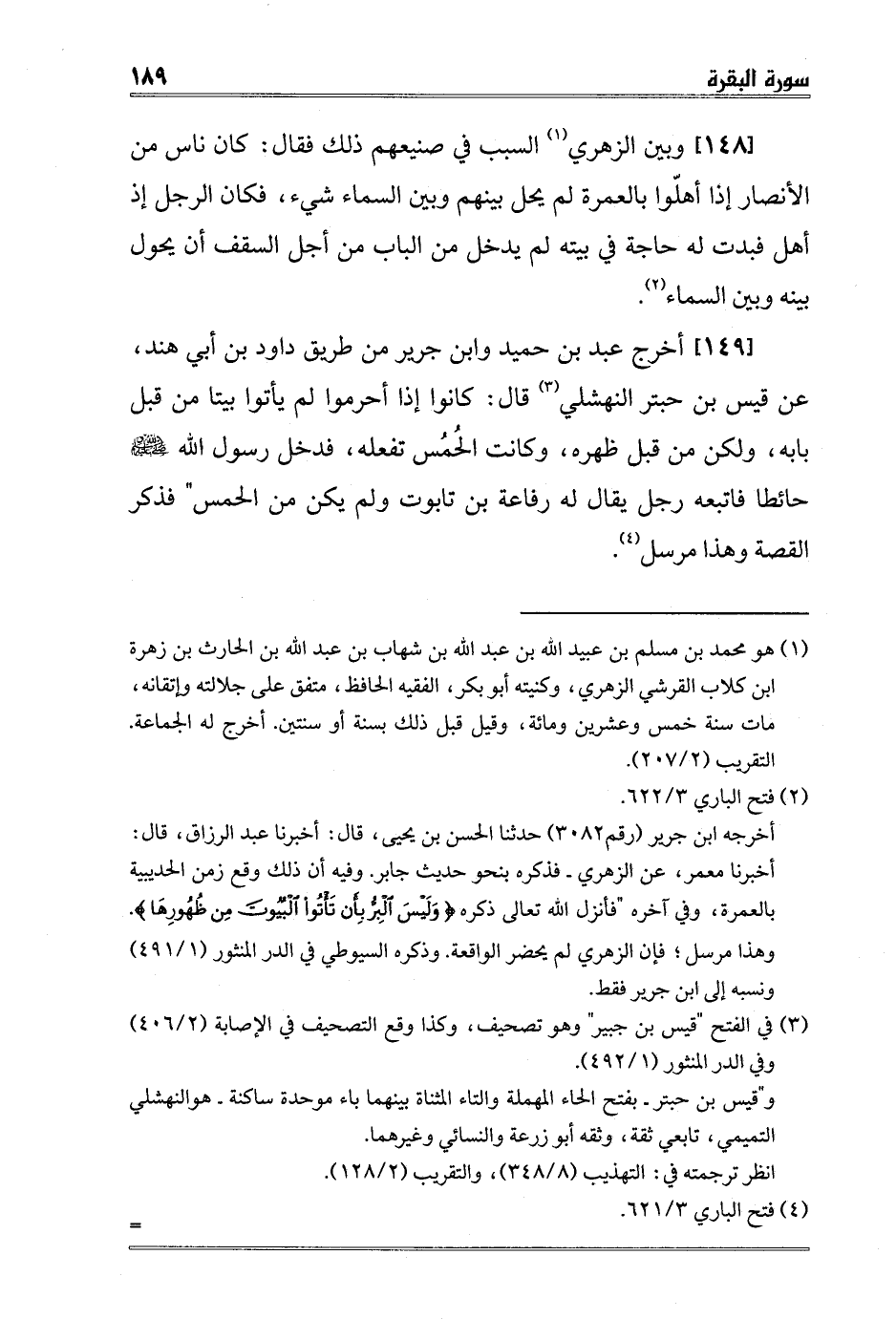 [149] أخرج عبد بن حميد وابن جرير من طريق داود بن أبي هند، عن قيس بن حبتر النهشلي3 قال: كانوا إذا أحرموا لم يأتوا بيتا من قبل بابه، ولكن من قبل ظهره، وكانت الحُمُس تفعله، فدخل رسول الله صلى الله عليه وسلم حائطا فاتبعه رجل يقال له رفاعة بن تابوت ولم يكن من الحمس" فذكر القصة وهذا مرسل4.