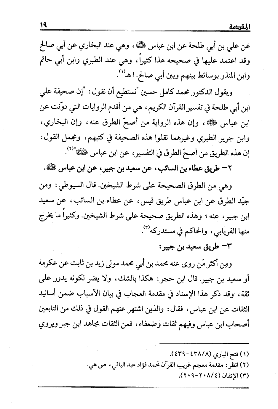 ويقول الدكتور محمد كامل حسين "نستطيع أن نقول: "إن صحيفة علي ابن أبي طلحة في تفسير القرآن الكريم، هي من أقدم الروايات التي دوّنت عن ابن عباس رضي الله عنه، وإن هذه الرواية من أصحّ الطرق عنه، وإن البخاري، وابن جرير الطبري وغيرهما نقلوا هذه الصحيفة في كتبهم، ومجمل القول: إن هذه الطريق من أصحّ الطرق في التفسير، عن ابن عباس رضي الله عنهما"2.