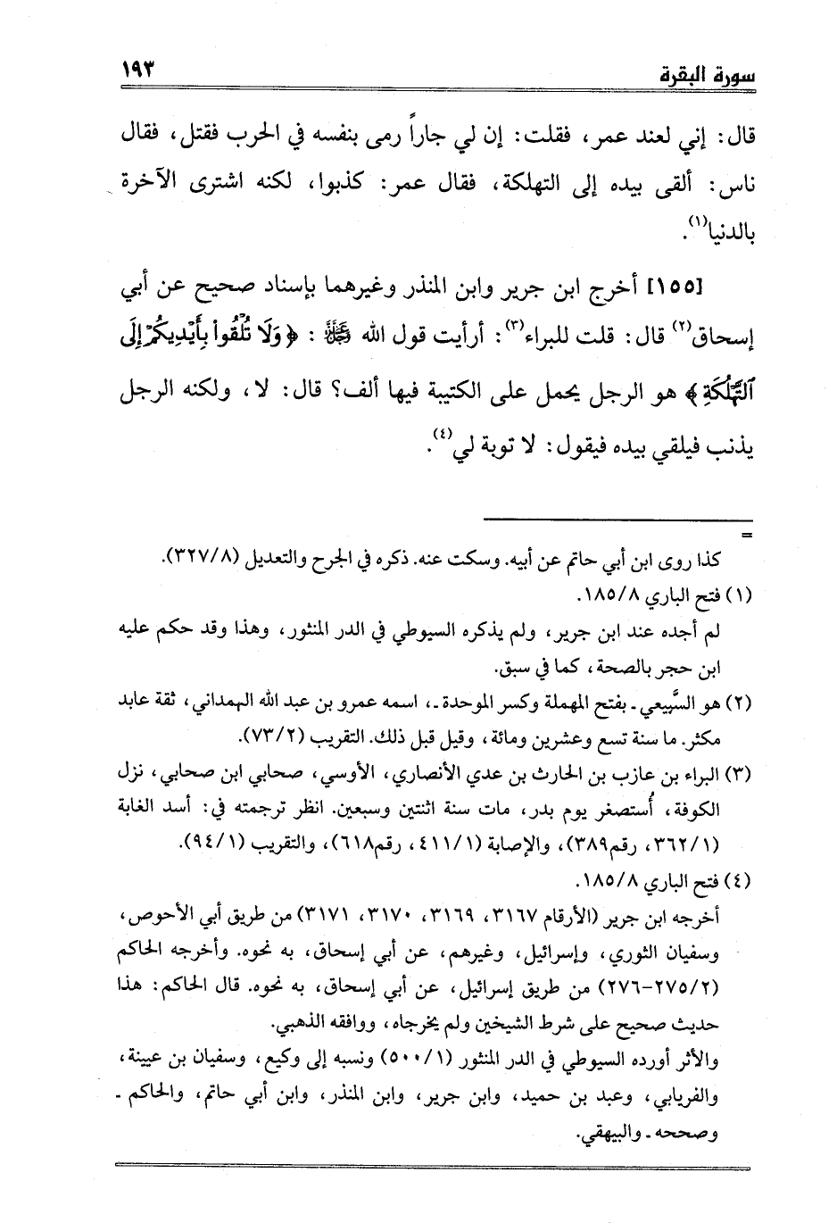 [155] أخرج ابن جرير وابن المنذر وغيرهما بإسناد صحيح عن أبي إسحاق2 قال: قلت للبراء3: أرأيت قول الله عز وجل: {وَلا تُلْقُوا بِأَيْدِيكُمْ إِلَى التَّهْلُكَةِ} هو الرجل يحمل على الكتيبة فيها ألف؟ قال: لا، ولكنه الرجل يذنب فيلقي بيده فيقول: لا توبة لي4.