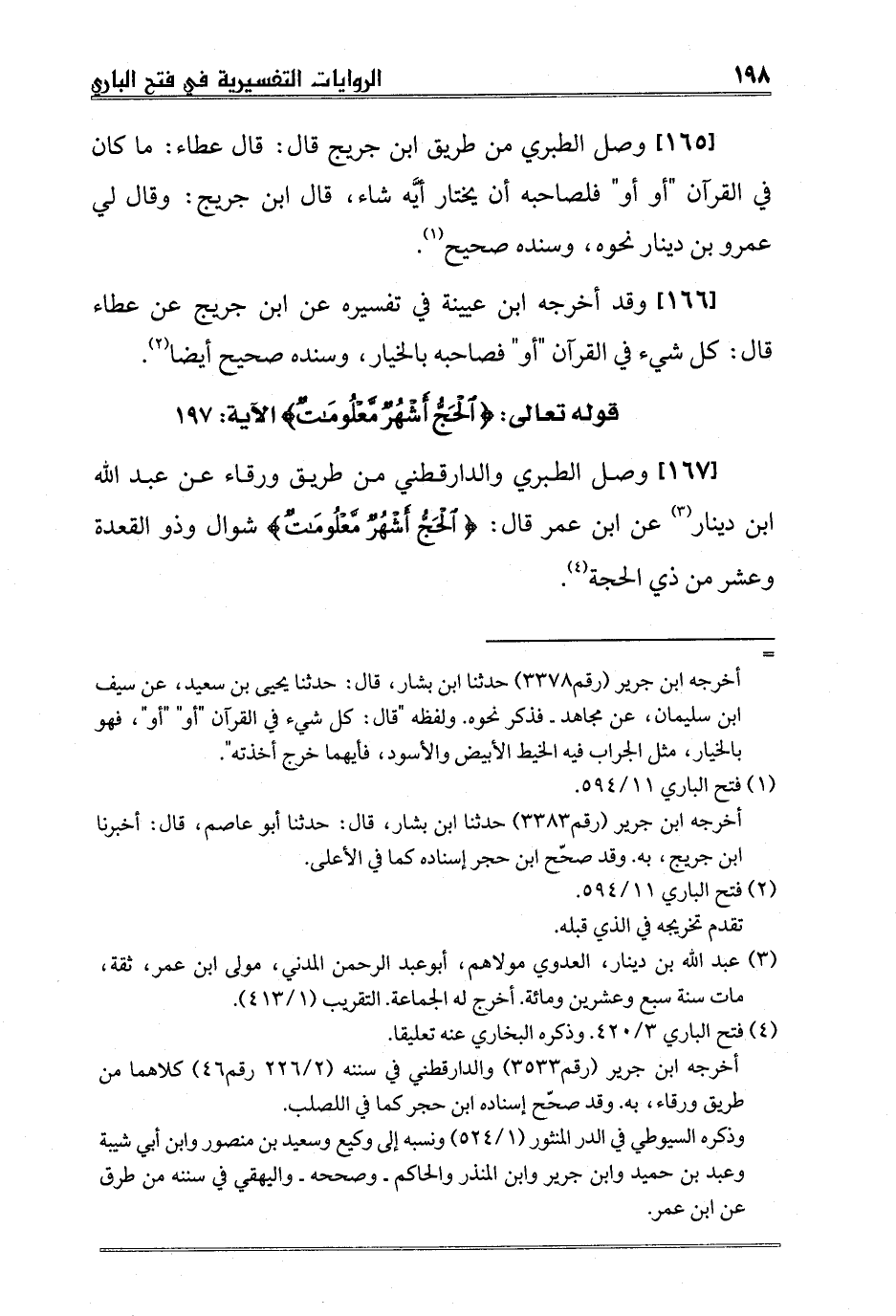 [167] وصل الطبري والدارقطني من طريق ورقاء عن عبد الله ابن دينار3 عن ابن عمر قال: {الْحَجُّ أَشْهُرٌ مَعْلُومَاتٌ} شوال وذو القعدة وعشر من ذي الحجة4.