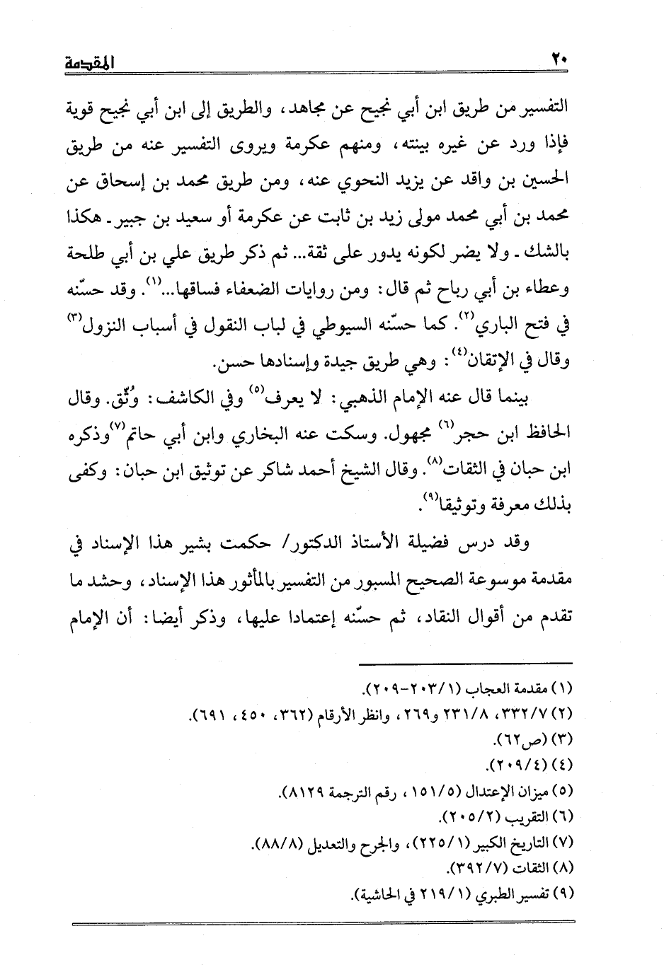 وقد درس فضيلة الأستاذ الدكتور/ حكمت بشير هذا الإسناد في مقدمة موسوعة الصحيح المسبور من التفسير بالمأثور هذا الإسناد، وحشد ما تقدم من أقوال النقاد، ثم حسّنه إعتمادا عليها، وذكر أيضا: أن الإمام