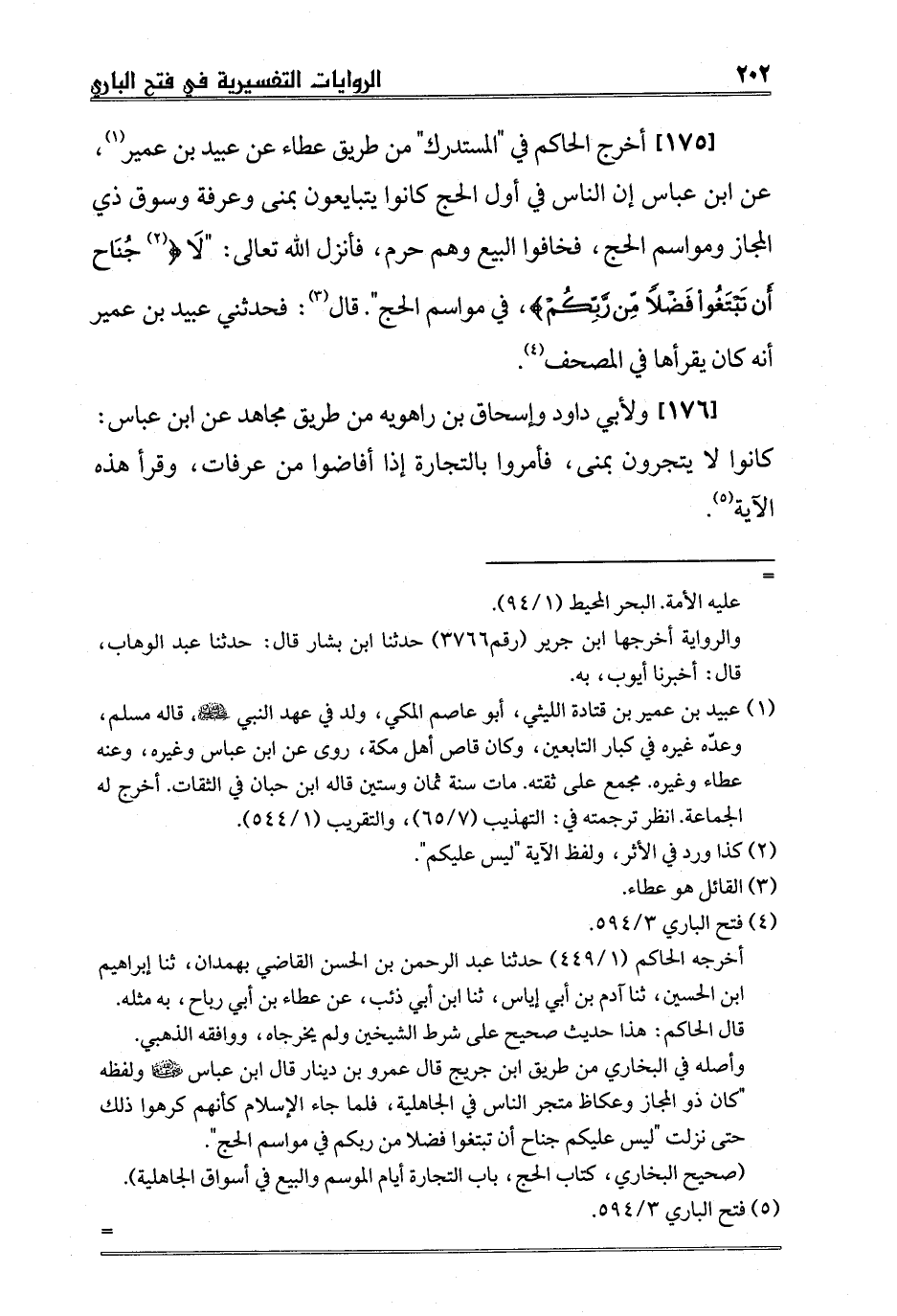 [175] أخرج الحاكم في "المستدرك" من طريق عطاء عن عبيد بن عمير1، عن ابن عباس إن الناس في أول الحج كانوا يتبايعون بمنى وعرفة وسوق ذي المجاز ومواسم الحج، فخافوا البيع وهم حرم، فأنزل الله تعالى: لا {2 جُنَاحٌ أَنْ تَبْتَغُوا فَضْلاً مِنْ رَبِّكُمْ} ، في مواسم الحج". قال3: فحدثني عبيد بن عمير أنه كان يقرأها في المصحف4.