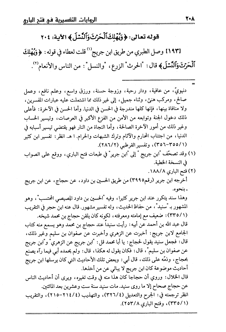 [193] وصل الطبري من طريق ابن جريج1 قلت لعطاء في قوله: {وَيُهْلِكَ الْحَرْثَ وَالنَّسْلَ} قال: "الحرث" الزرع، "والنسل": من الناس والأنعام2.