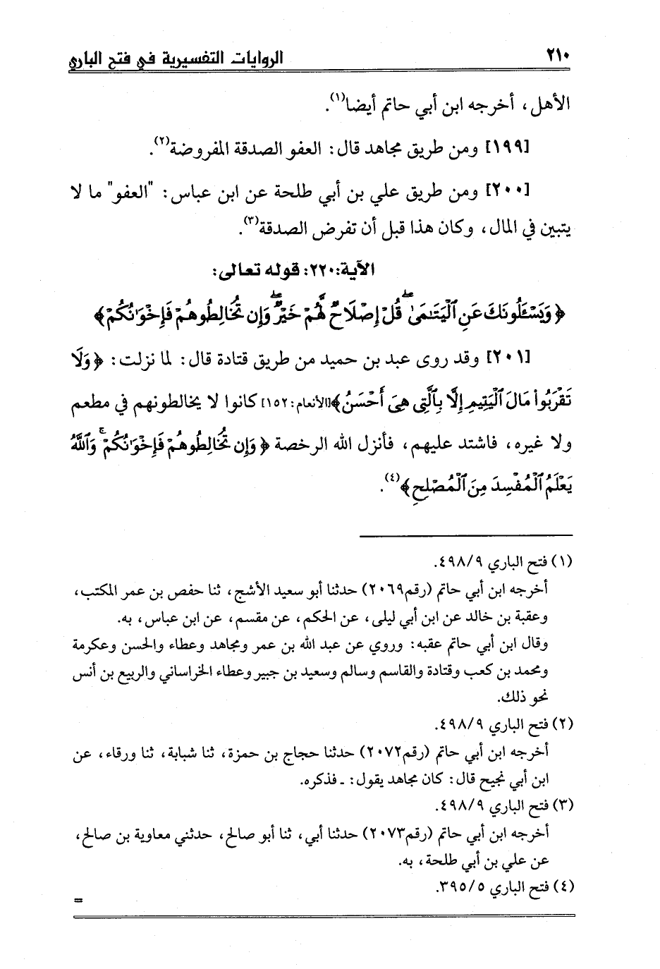 [201] وقد روى عبد بن حميد من طريق قتادة قال: لما نزلت: {وَلا تَقْرَبُوا مَالَ الْيَتِيمِ إِلَّا بِالَّتِي هِيَ أَحْسَنُ} [الأنعام:152] كانوا لا يخالطونهم في مطعم ولا غيره، فاشتد عليهم، فأنزل الله الرخصة {وَإِنْ تُخَالِطُوهُمْ فَإِخْوَانُكُمْ وَاللَّهُ يَعْلَمُ الْمُفْسِدَ مِنَ الْمُصْلِحِ} 4.