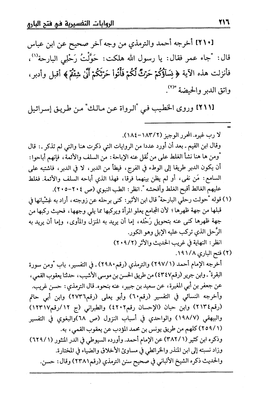 [210] أخرجه أحمد والترمذي من وجه آخر صحيح عن ابن عباس قال: "جاء عمر فقال: يا رسول الله هلكت: حَوَّلْتُ رَحْلِي البارحة1، فأنزلت هذه الآية {نِسَاؤُكُمْ حَرْثٌ لَكُمْ فَأْتُوا حَرْثَكُمْ أَنَّى شِئْتُمْ} أقبل وأدبر، واتق الدبر والحيضة "2.