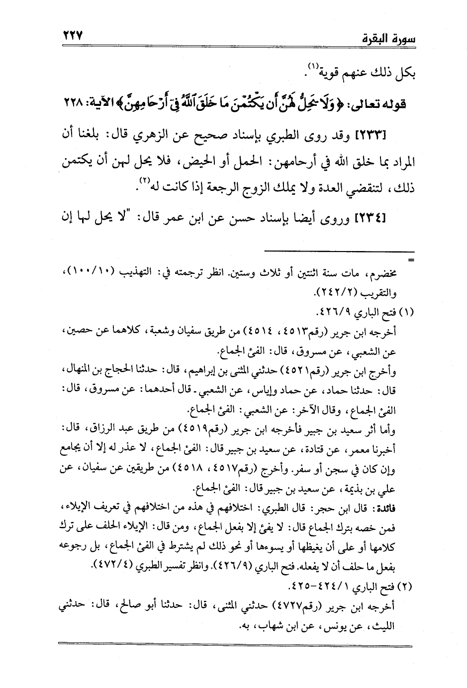 [233] وقد روى الطبري بإسناد صحيح عن الزهري قال: بلغنا أن المراد بما خلق الله في أرحامهن: الحمل أو الحيض، فلا يحل لهن أن يكتمن ذلك، لتنقضي العدة ولا يملك الزوج الرجعة إذا كانت له2.