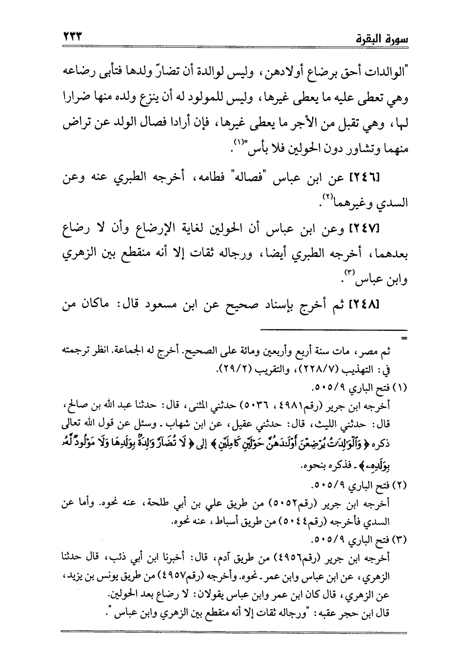 [247] وعن ابن عباس أن الحولين لغاية الإرضاع وأن لا رضاع بعدهما، أخرجه الطبري أيضا، ورجاله ثقات إلا أنه منقطع بين الزهري وابن عباس3.