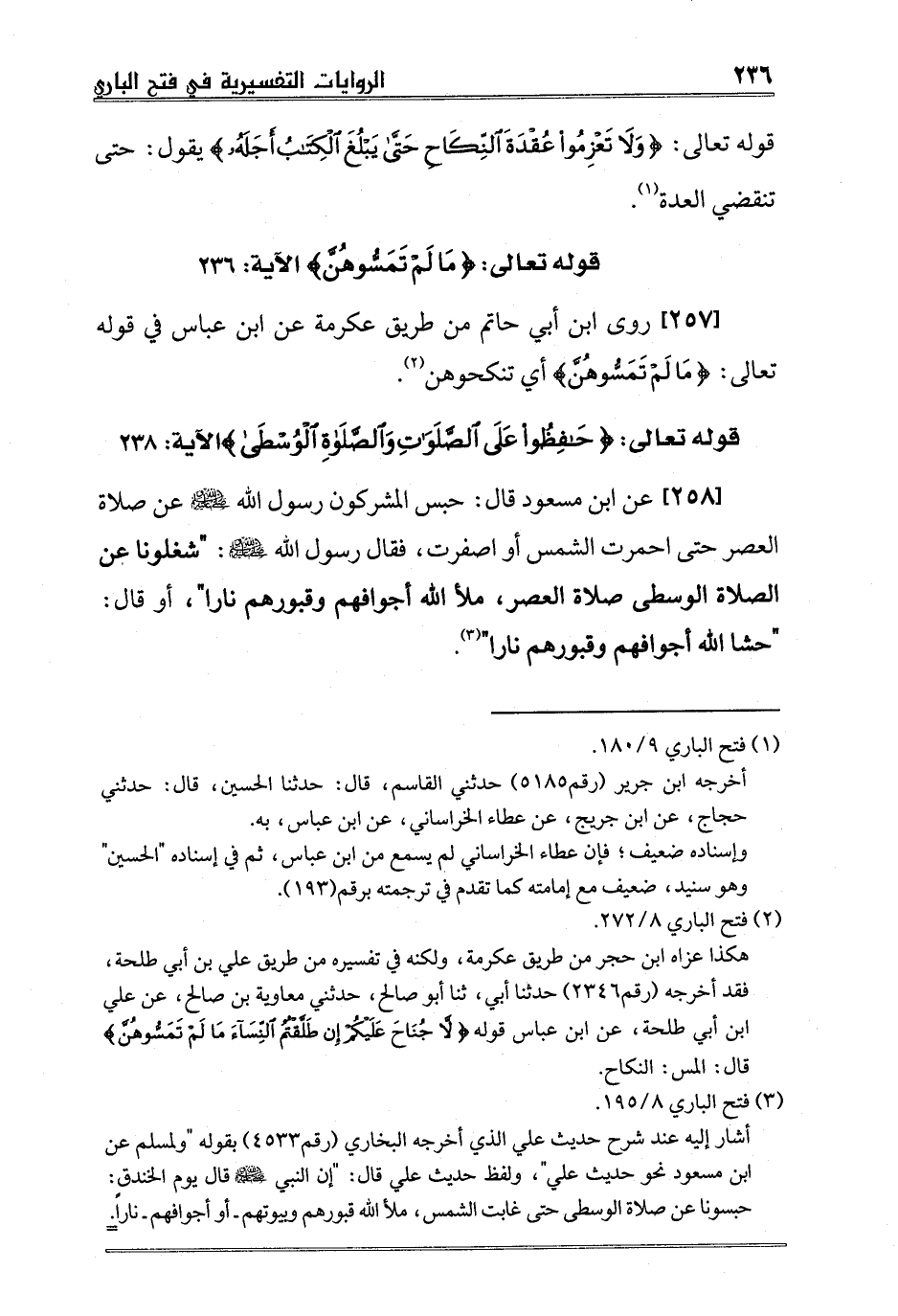 [257] روى ابن أبي حاتم من طريق عكرمة عن ابن عباس في قوله تعالى: {مَا لَمْ تَمَسُّوهُنَّ} أي تنكحوهن2.