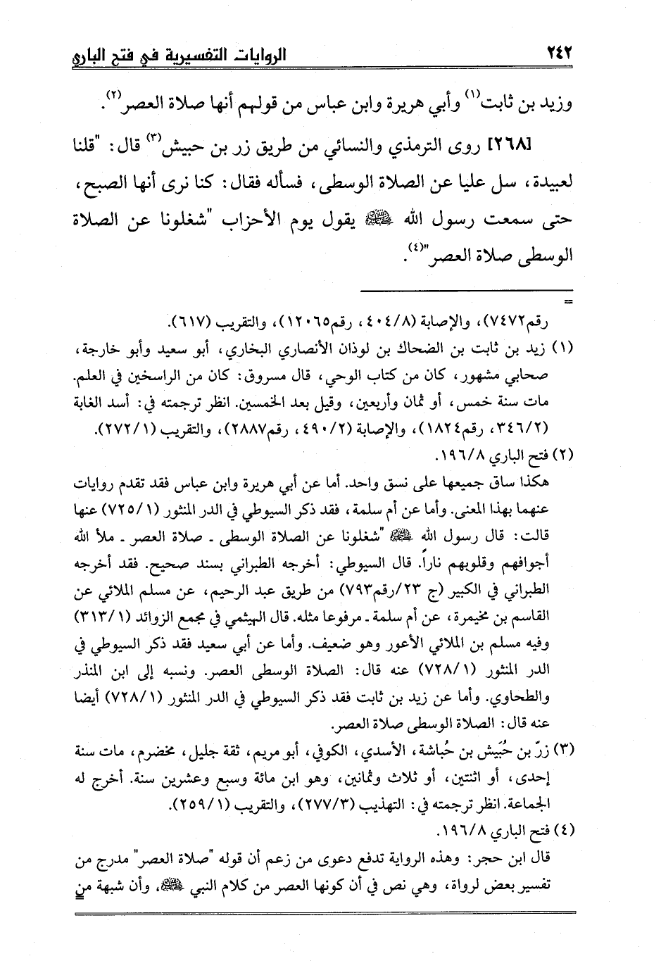 [268] روى الترمذي والنسائي من طريق زر بن حبيش3 قال: "قلنا لعبيدة، سل عليا عن الصلاة الوسطى، فسأله فقال: كنا نرى أنها الصبح، حتى سمعت رسول الله صلى الله عليه وسلم يقول يوم الأحزاب "شغلونا عن الصلاة الوسطى صلاة العصر" 4.