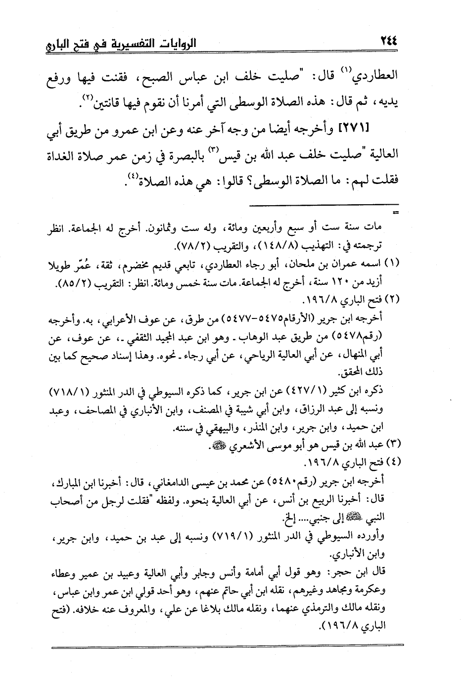 [271] وأخرجه أيضا من وجه آخر عنه وعن ابن عمرو من طريق أبي العالية "صليت خلف عبد الله بن قيس3 بالبصرة في زمن عمر صلاة الغداة فقلت لهم: ما الصلاة الوسطى؟ قالوا: هي هذه الصلاة4.