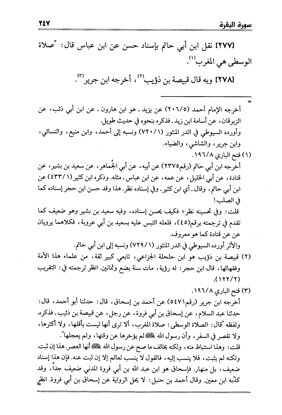 [277] نقل ابن أبي حاتم بإسناد حسن عن ابن عباس قال: "صلاة الوسطى هي المغرب1.