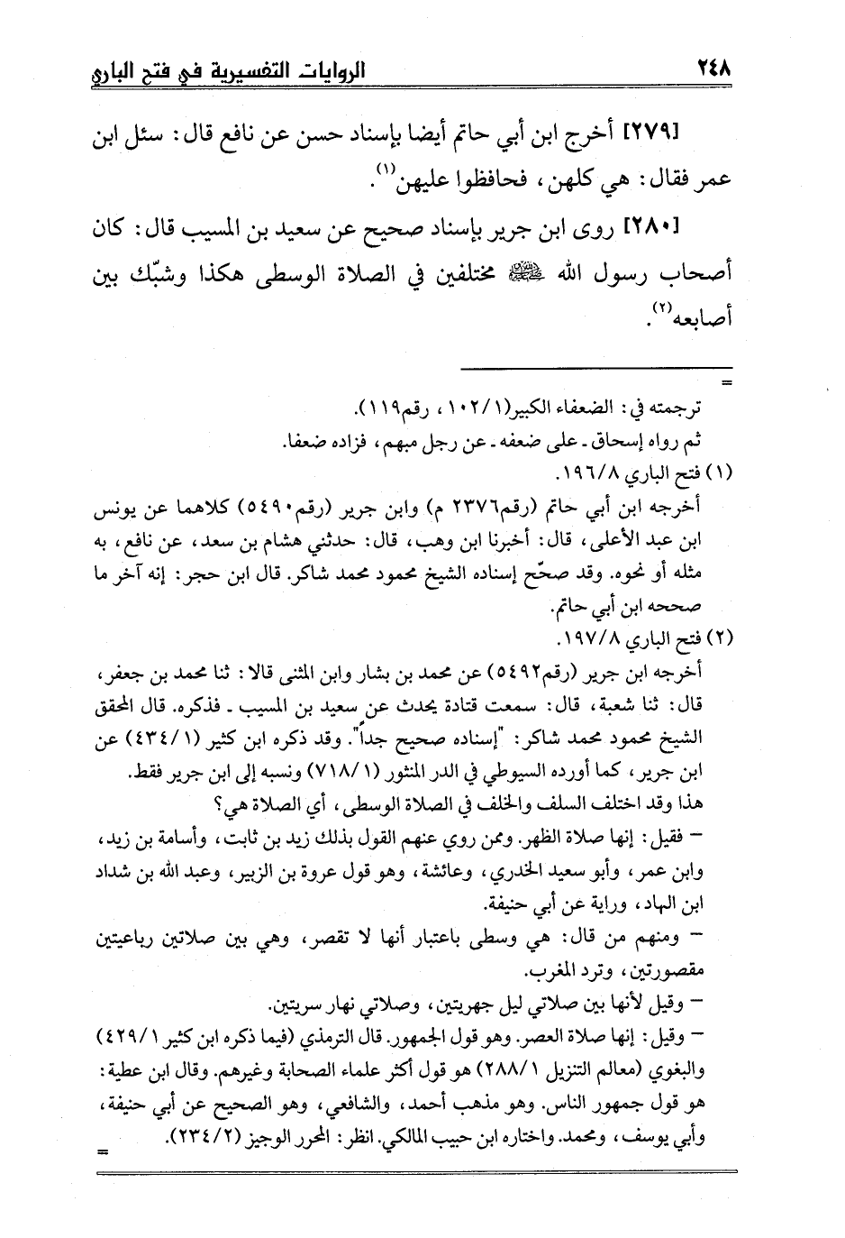[279] أخرج ابن أبي حاتم أيضا بإسناد حسن عن نافع قال: سئل ابن عمر فقال: هي كلهن، فحافظوا عليهن1.