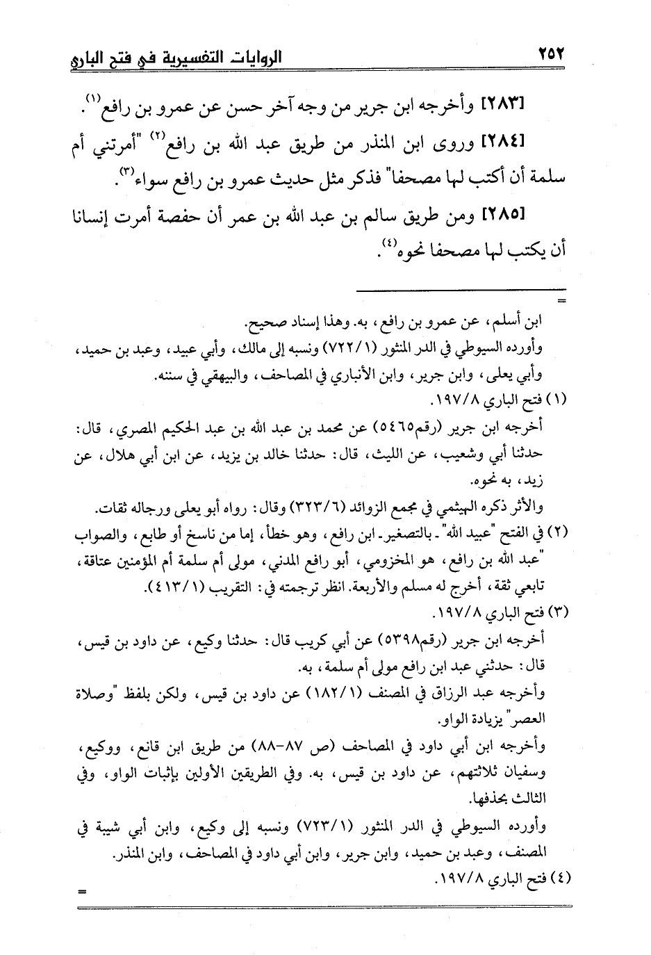4 فتح الباري 8/197. أخرجه ابن جرير رقم5461 وابن أبي داود في المصاحف ص 85 كلاهما عن محمد ابن بشار، قال: حدثنا محمد بن جعفر، قال: حدثنا شعبة، عن أبي بشر، عن عبد الله ابن يزيد الأزدي، عن سالم بن عبد الله، به. وهذا إسناد صحيح.