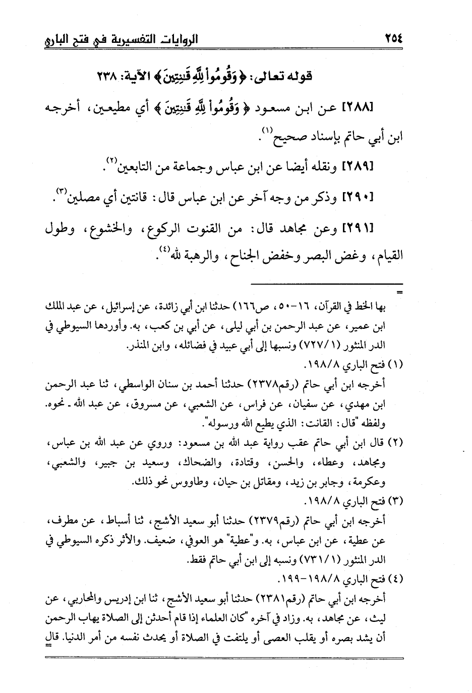 [288] عن ابن مسعود {وَقُومُوا لِلَّهِ قَانِتِينَ} أي مطيعين، أخرجه ابن أبي حاتم بإسناد صحيح1.