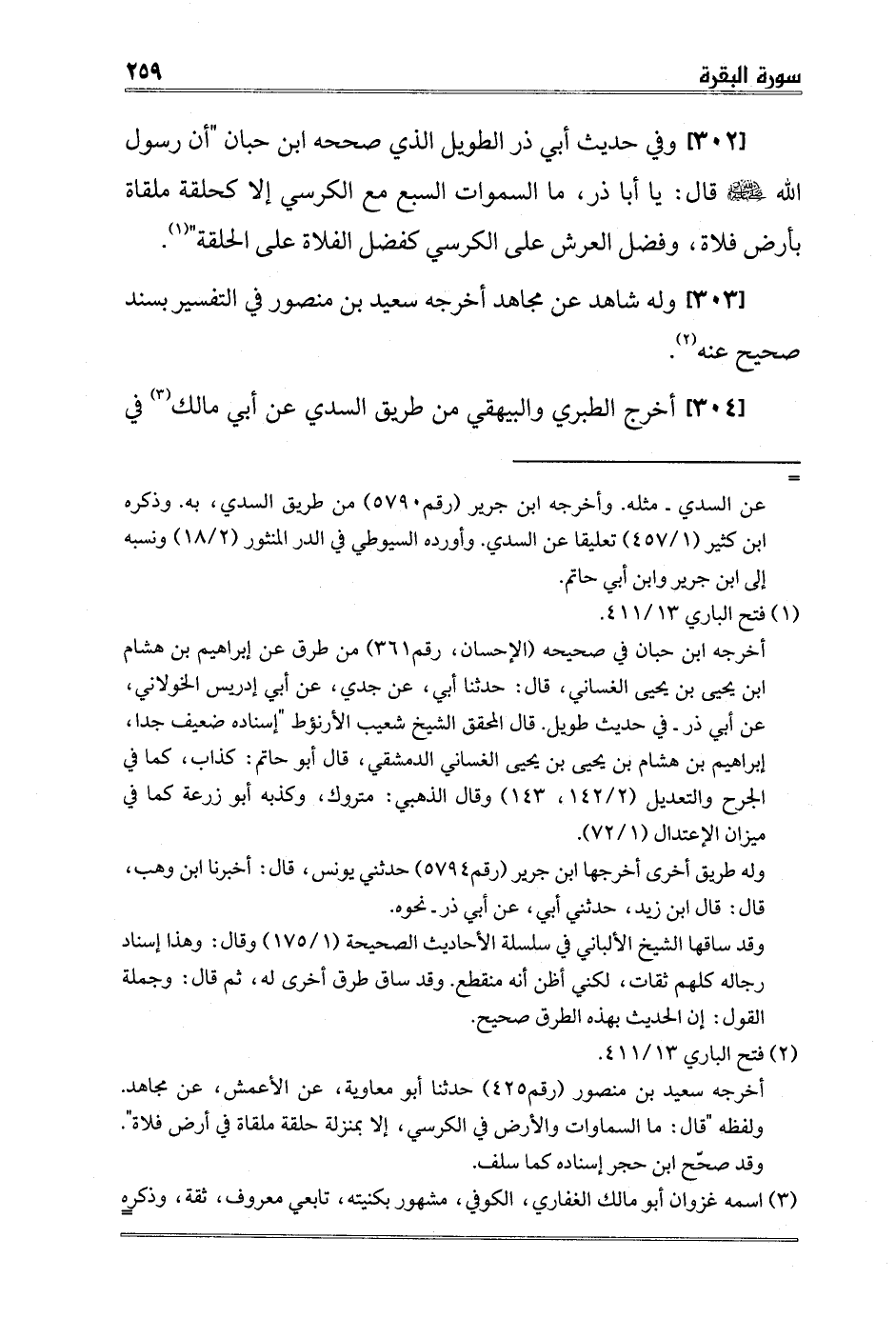[302] وفي حديث أبي ذر الطويل الذي صححه ابن حبان "أن رسول الله صلى الله عليه وسلم قال: "يا أبا ذر، ما السموات السبع مع الكرسي إلا كحلقة ملقاة بأرض فلاة، وفضل العرش على الكرسي كفضل الفلاة على الحلقة" 1.