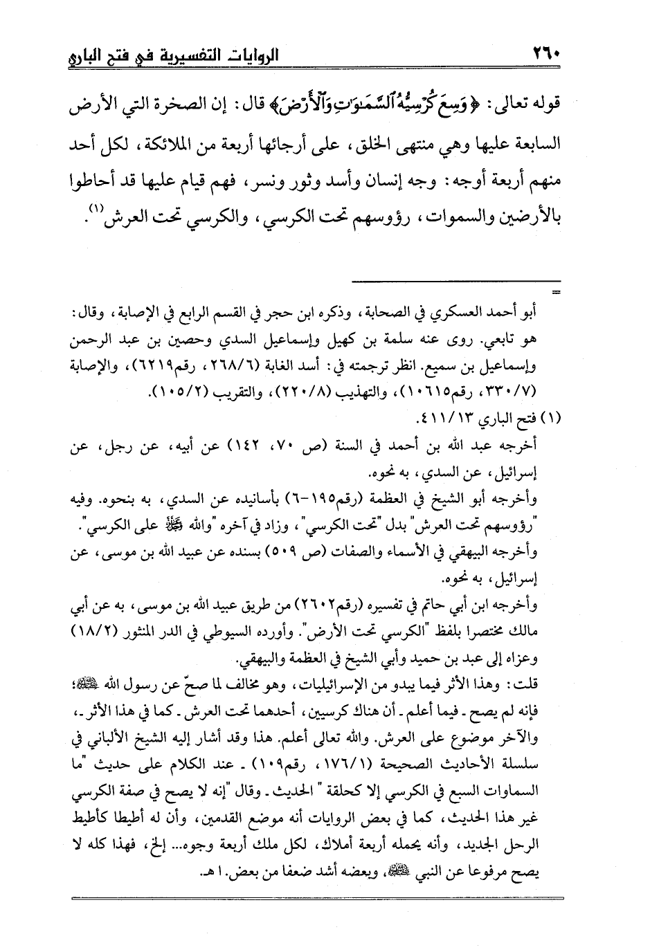 قلت: وهذا الأثر فيما يبدو من الإسرائيليات، وهو مخالف لما صحّ عن رسول الله صلى الله عليه وسلم؛ فإنه لم يصح - فيما أعلم - أن هناك كرسيين، أحدهما تحت العرش - كما في هذا الأثر -، والآخر موضوع على العرش. والله تعالى أعلم. هذا وقد أشار إليه الشيخ الألباني في سلسلة الأحاديث الصحيحة 1/176، رقم109 - عند الكلام على حديث "ما السماوات السبع في الكرسي إلا كحلقة " الحديث - وقال "إنه لا يصح في صفة الكرسي غير هذا الحديث، كما في بعض الروايات أنه موضع القدمين، وأن له أطيطا كأطيط الرحل الجديد، وأنه يحمله أربعة أملاك، لكل ملك أربعة وجوه ... إلخ، فهذا كله لا يصح مرفوعا عن النبي صلى الله عليه وسلم، وبعضه أشد ضعفا من بعض. اهـ.
