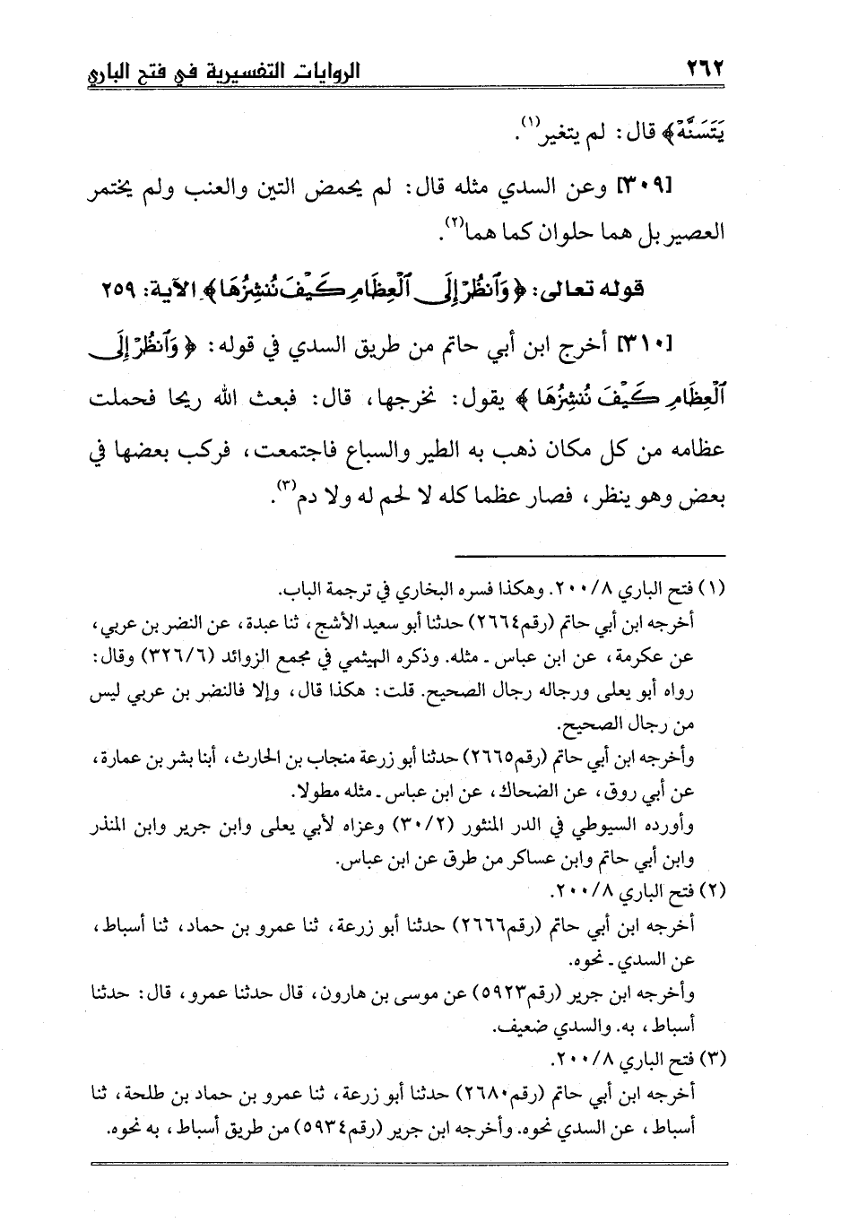 [310] أخرج ابن أبي حاتم من طريق السدي في قوله: {وَانْظُرْ إِلَى الْعِظَامِ كَيْفَ نُنْشِزُهَا} يقول: نخرجها، قال: فبعث الله ريحا فحملت عظامه من كل مكان ذهب به الطير والسباع فاجتمعت، فركب بعضها في بعض وهو ينظر، فصار عظما كله لا لحم له ولا دم3.