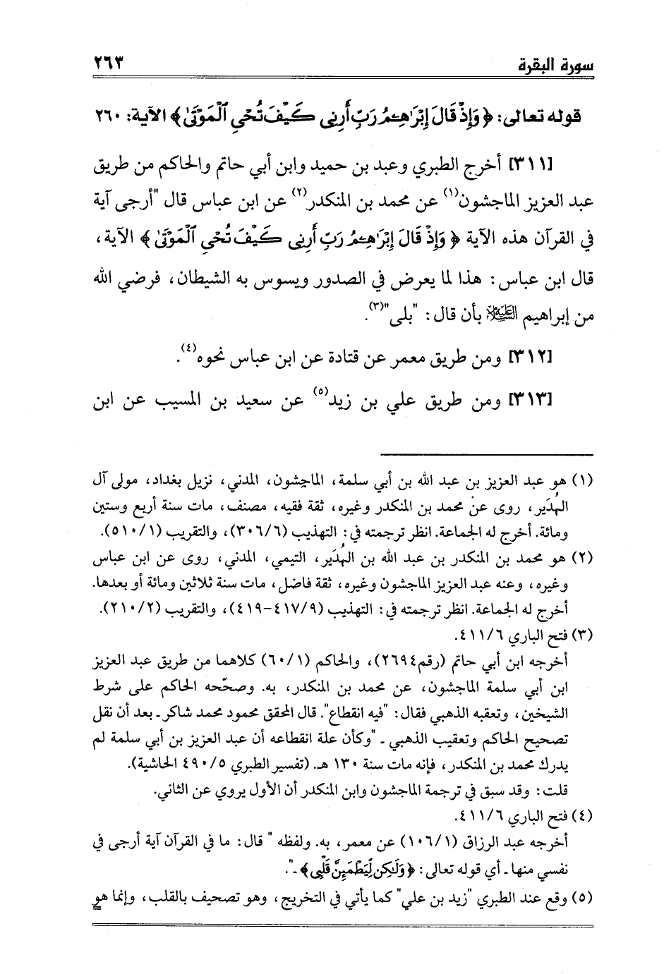 [311] أخرج الطبري وعبد بن حميد وابن أبي حاتم والحاكم من طريق عبد العزيز الماجشون1 عن محمد بن المنكدر2 عن ابن عباس قال "أرجى آية في القرآن هذه الآية {وَإِذْ قَالَ إِبْرَاهِيمُ رَبِّ أَرِنِي كَيْفَ تُحْيِي الْمَوْتَى} الآية، قال ابن عباس: هذا لما يعرض في الصدور ويسوس به الشيطان، فرضي الله من إبراهيم عليه السلام بأن قال: "بلى" 3.