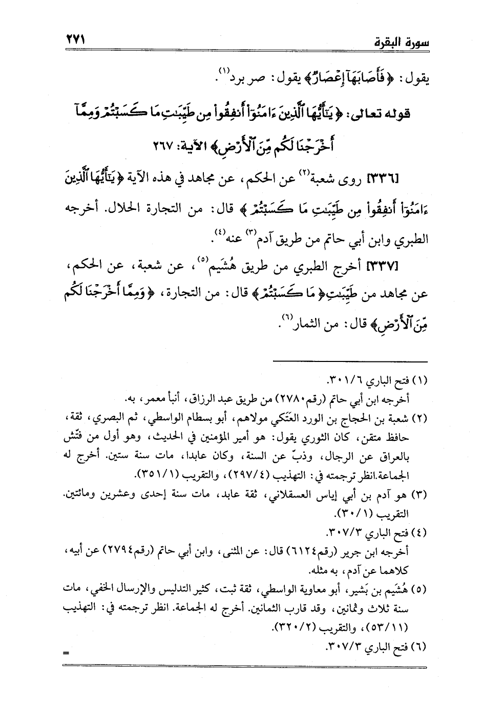 [337] أخرج الطبري من طريق هُشَيم5، عن شعبة، عن الحكم، عن مجاهد من {طَيِّبَاتِ مَا كَسَبْتُمْ} قال: من التجارة، {وَمِمَّا أَخْرَجْنَا لَكُمْ مِنَ الْأَرْضِ} قال: من الثمار6.