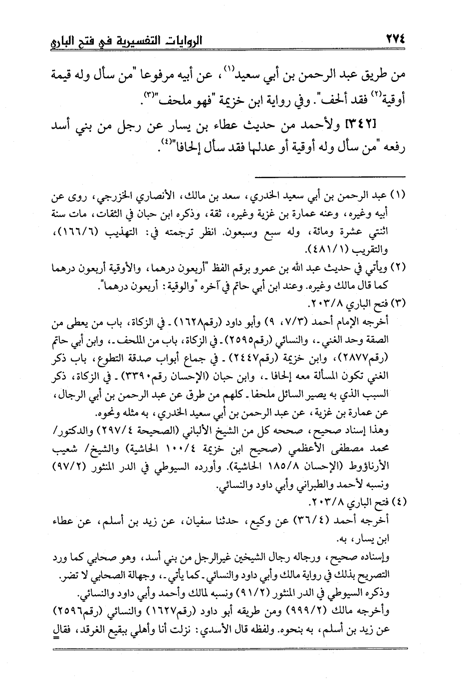 أخرجه الإمام أحمد 3/7، 9 وأبو داود رقم1628 - في الزكاة، باب من يعطى من الصقة وحد الغني -، والنسائي رقم2595 - في الزكاة، باب من الملحف -، وابن أبي حاتم رقم2877، وابن خزيمة رقم2447 - في جماع أبواب صدقة التطوع، باب ذكر الغني تكون المسألة معه إلحافا -، وابن حبان الإحسان رقم3390 - في الزكاة، ذكر السبب الذي به يصير السائل ملحفا - كلهم من طرق عن عبد الرحمن بن أبي الرجال، عن عمارة بن غزية، عن عبد الرحمن بن أبي سعيد الخدري، به مثله ونحوه.