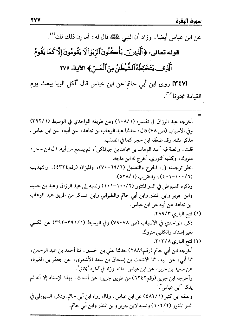 [347] روى ابن أبي حاتم عن ابن عباس قال "آكل الربا يبعث يوم القيامة مجنونا"2.