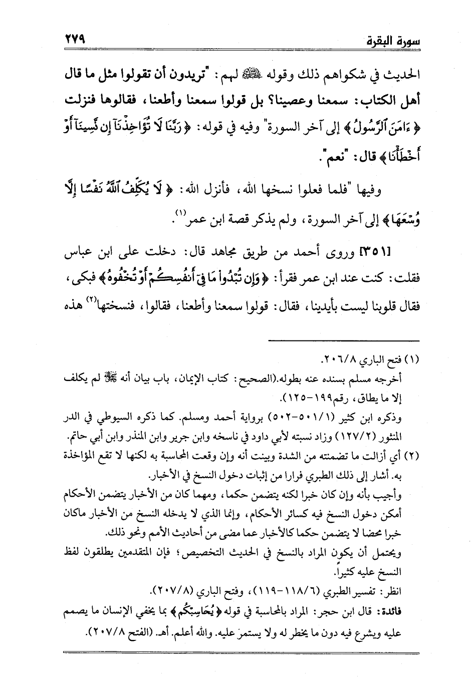[351] وروى أحمد من طريق مجاهد قال: دخلت على ابن عباس فقلت: كنت عند ابن عمر فقرأ: {وَإِنْ تُبْدُوا مَا فِي أَنْفُسِكُمْ أَو تُخْفُوهُ} فبكى، فقال قلوبنا ليست بأيدينا، فقال: قولوا سمعنا وأطعنا، فقالوا، فنسختها2 هذه
