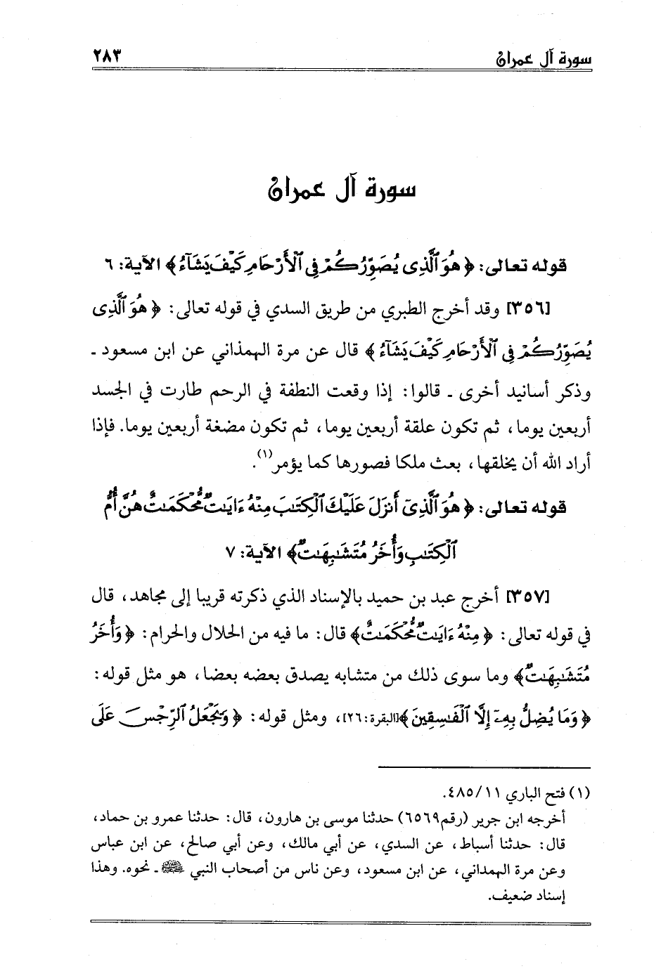 [357] أخرج عبد بن حميد بالإسناد الذي ذكرته قريبا إلى مجاهد، قال في قوله تعالى: {مِنْهُ آيَاتٌ مُحْكَمَاتٌ} قال: ما فيه من الحلال والحرام: {وَأُخَرُ مُتَشَابِهَاتٌ} وما سوى ذلك من متشابه يصدق بعضه بعضا، هو مثل قوله: {وَمَا يُضِلُّ بِهِ إِلَّا الْفَاسِقِينَ} [البقرة:26] ، ومثل قوله: {وَيَجْعَلُ الرِّجْسَ عَلَى