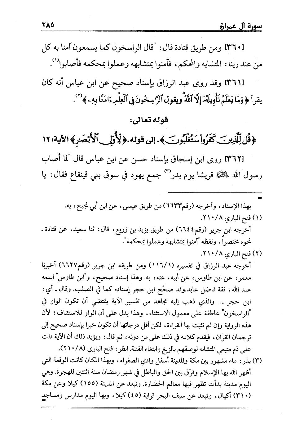 3 بدر: ماء مشهور بين مكة والمدينة أسفل وادي الصفراء، وبهذا المكان كانت الوقعة التي أظهر الله بها الإسلام وفرّق بين الحق والباطل في شهر رمضان سنة اثنتين للهجرة. وهي اليوم مدينة بدأت تظهر فيها معالم الحضارة. وتبعد عن المدينة 155 كيلا وعن مكة 310 أكيال، وتبعد عن سيف البحر قرابة 45 كيلا، وبها اليوم مدارس ومساجد وجامع كبير. وقد وقفت عليها. انظر: معجم البلدان 1/425، رقم1527، ومعجم المعالم الجغرافية في السيرة النبوية، ص 41.