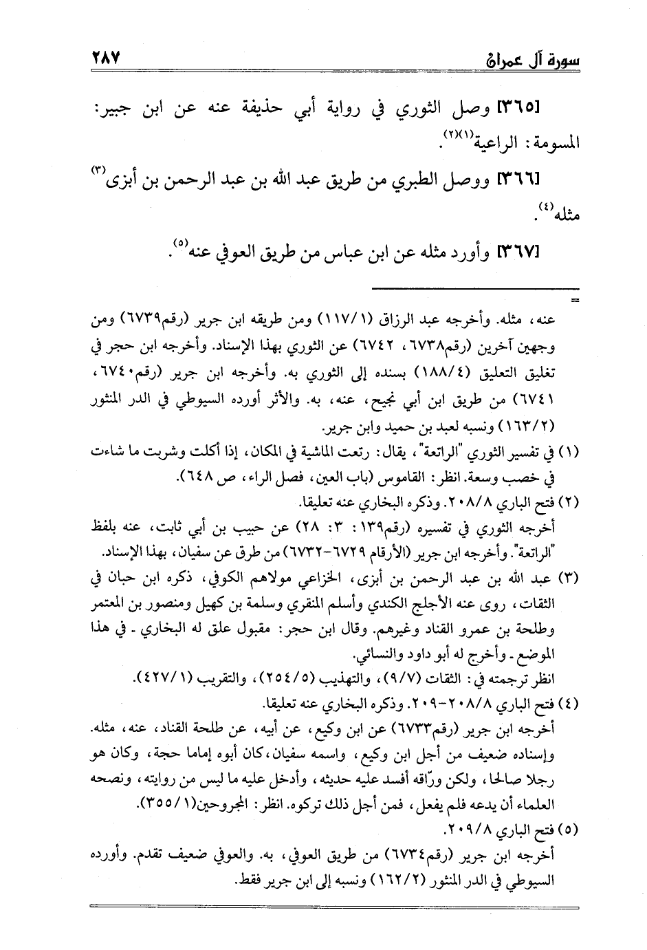 [365] وصل الثوري في رواية أبي حذيفة عنه عن ابن جبير: المسومة: الراعية1 2.