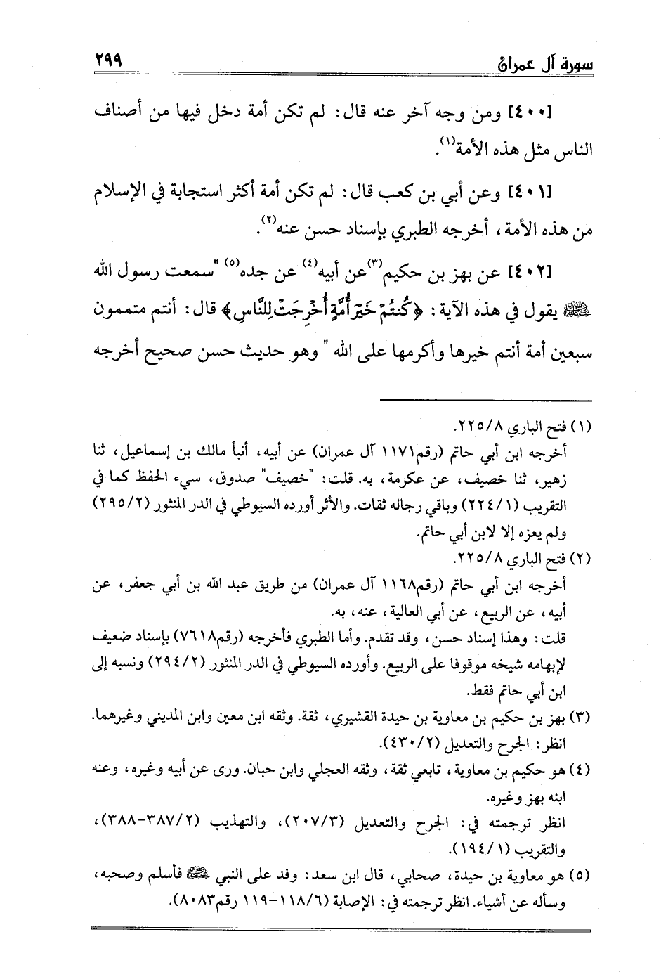 [402] عن بهز بن حكيم3 عن أبيه4 عن جده5 "سمعت رسول الله صلى الله عليه وسلم يقول في هذه الآية: {كُنْتُمْ خَيْرَ أُمَّةٍ أُخْرِجَتْ لِلنَّاسِ} قال: "أنتم متممون سبعين أمة أنتم خيرها وأكرمها على الله " وهو حديث حسن صحيح أخرجه