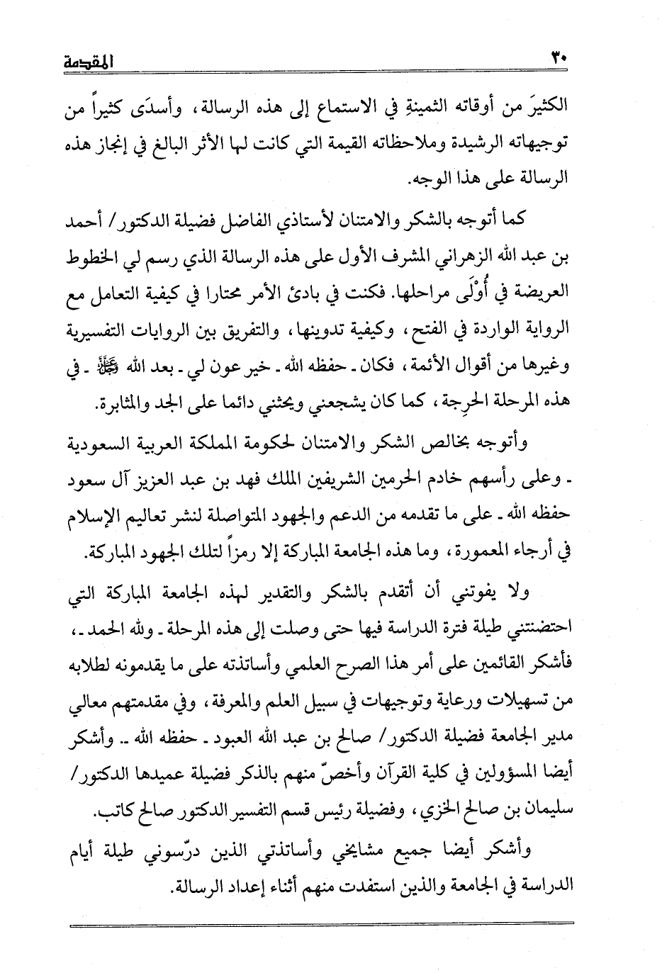 كما أتوجه بالشكر والامتنان لأستاذي الفاضل فضيلة الدكتور/ أحمد بن عبد الله الزهراني المشرف الأول على هذه الرسالة الذي رسم لي الخطوط العريضة في أُوْلَى مراحلها. فكنت في بادئ الأمر محتارا في كيفية التعامل مع الرواية الواردة في الفتح، وكيفية تدوينها، والتفريق بين الروايات التفسيرية وغيرها من أقوال الأئمة، فكان - حفظه الله - خير عون لي - بعد الله عز وجل - في هذه المرحلة الحرِجة، كما كان يشجعني ويحثني دائما على الجد والمثابرة.