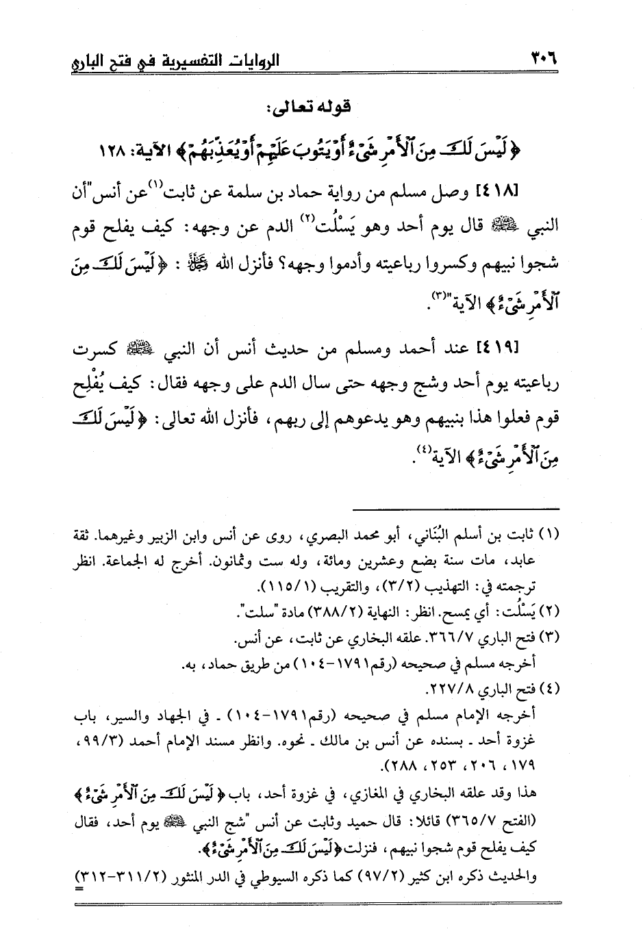 [418] وصل مسلم من رواية حماد بن سلمة عن ثابت1 عن أنس"أن النبي صلى الله عليه وسلم قال يوم أحد وهو يَسْلُت2 الدم عن وجهه: كيف يفلح قوم شجوا نبيهم وكسروا رباعيته وأدموا وجهه؟ فأنزل الله عز وجل: {لَيْسَ لَكَ مِنَ الْأَمْرِ شَيْءٌ} الآية"3.