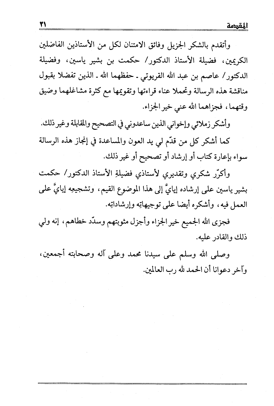 وأكرّر شكري وتقديري لأستاذي فضيلةِ الأستاذ الدكتور/ حكمت بشير ياسين على إرشاده إيايَّ إلى هذا الموضوع القيم، وتشجيعِه إيايَّ على العمل فيه، وأشكره أيضا على توجيهاتِه وإرشاداتِه.