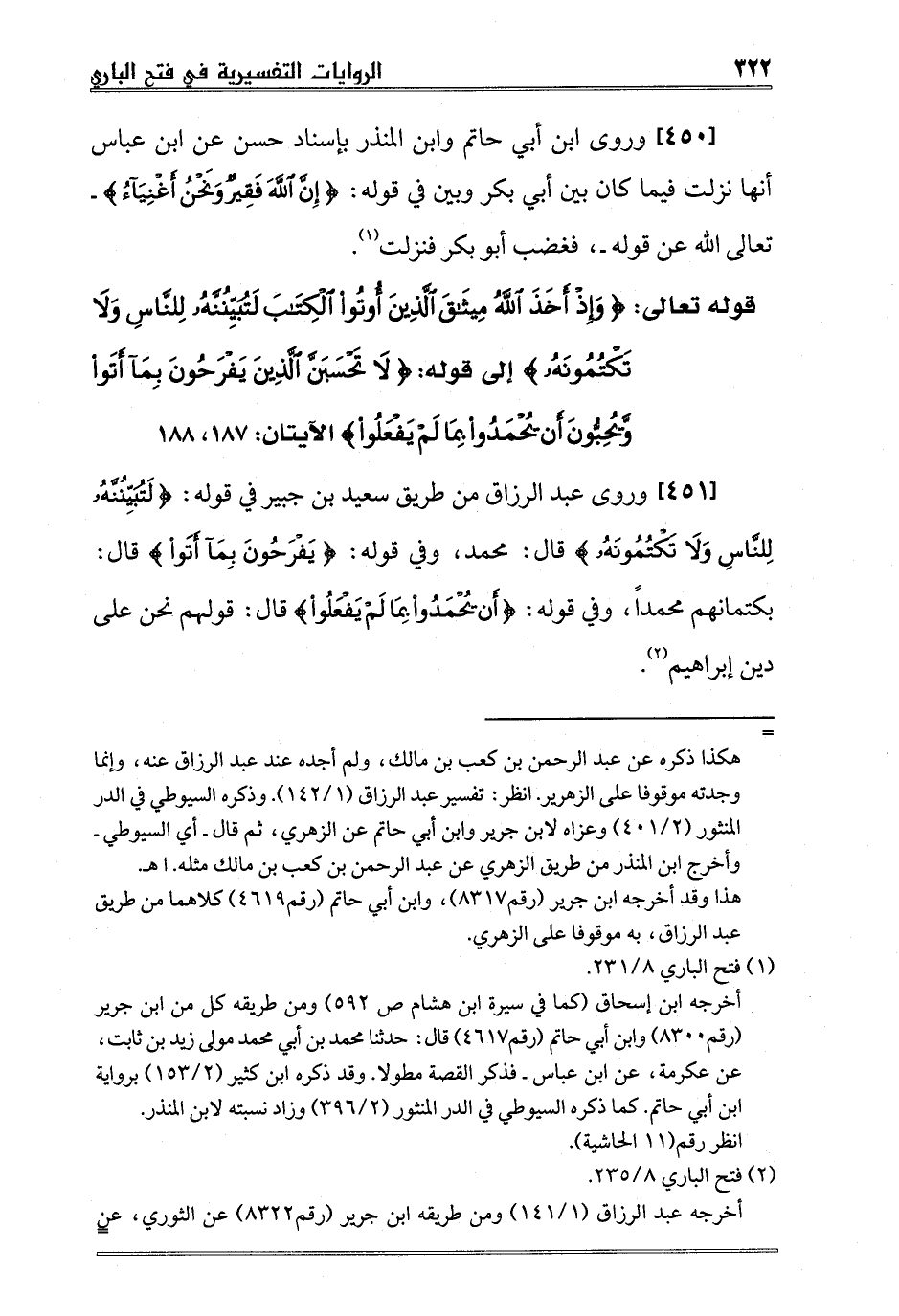 [451] وروى عبد الرزاق من طريق سعيد بن جبير في قوله: {لَتُبَيِّنُنَّهُ لِلنَّاسِ وَلا تَكْتُمُونَهُ} قال: محمد، وفي قوله: {يَفْرَحُونَ بِمَا أَتَوْا} قال: بكتمانهم محمداً، وفي قوله: {أَنْ يُحْمَدُوا بِمَا لَمْ يَفْعَلُوا} قال: قولهم نحن على دين إبراهيم2.