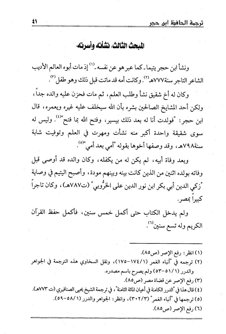 2 ترجمه في "أنباء الغمر 1/174-175، ونقل السخاوي هذه الترجمة في الجواهر والدرر 1/51-53 ولم يصرح باسم مصدره.