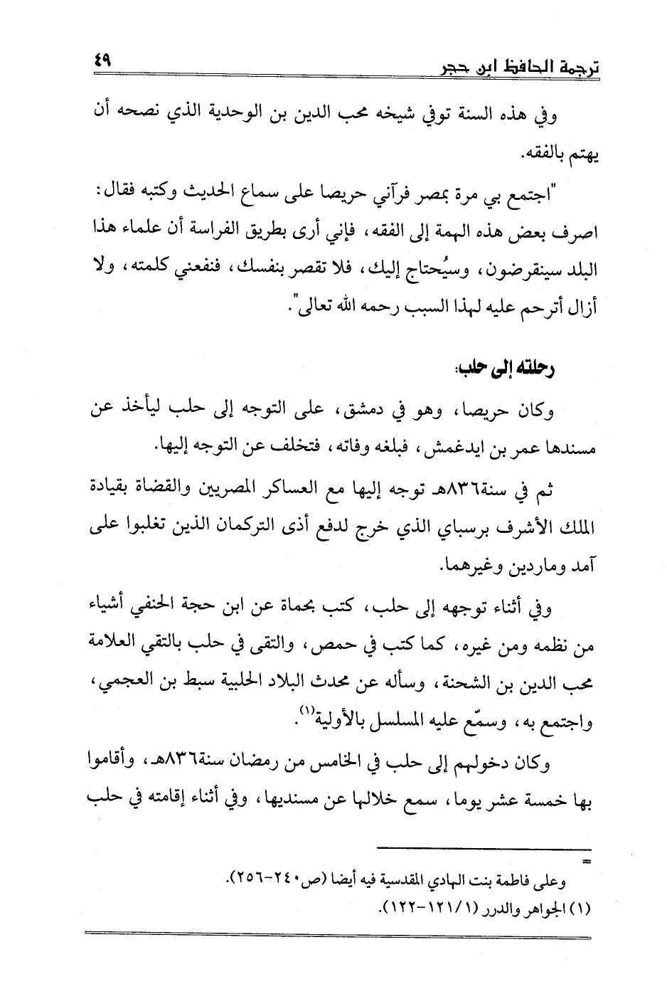 وفي أثناء توجهه إلى حلب، كتب بحماة عن ابن حجة الحنفي أشياء من نظمه ومن غيره، كما كتب في حمص، والتقى في حلب بالتقي العلامة محب الدين بن الشحنة، وسأله عن محدث البلاد الحلبية سبط بن العجمي، واجتمع به، وسمّع عليه المسلسل بالأولية1.