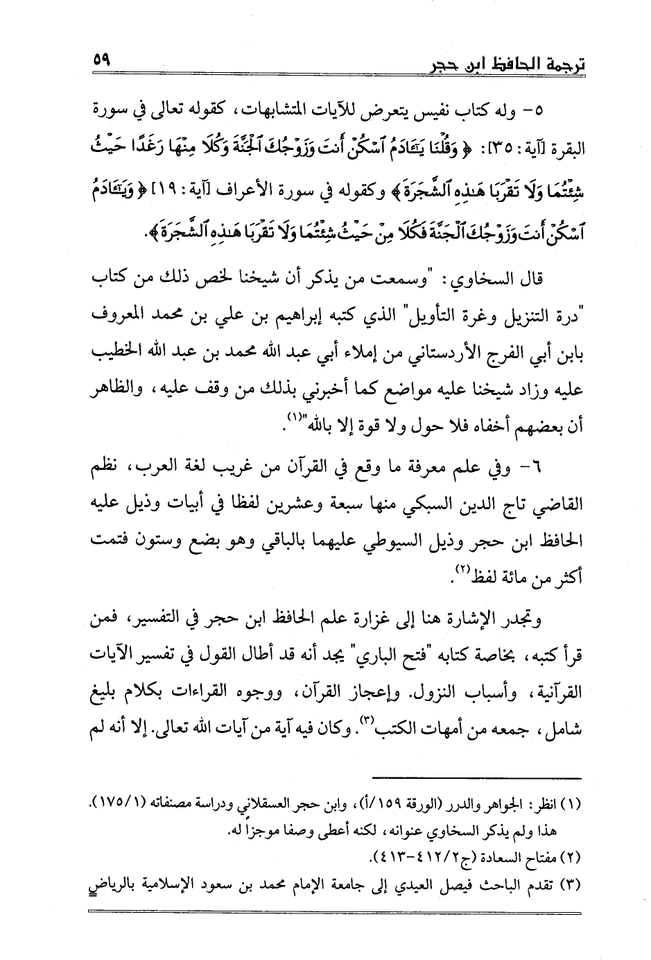 5- وله كتاب نفيس يتعرض للآيات المتشابهات، كقوله تعالى في سورة البقرة [آية: 35] : {وَقُلْنَا يَا آدَمُ اسْكُنْ أَنْتَ وَزَوْجُكَ الْجَنَّةَ وَكُلا مِنْهَا رَغَداً حَيْثُ شِئْتُمَا وَلا تَقْرَبَا هَذِهِ الشَّجَرَةَ} وكقوله في سورة الأعراف [آية: 19] {وَيَا آدَمُ اسْكُنْ أَنْتَ وَزَوْجُكَ الْجَنَّةَ فَكُلا مِنْ حَيْثُ شِئْتُمَا وَلا تَقْرَبَا هَذِهِ الشَّجَرَةَ} .
