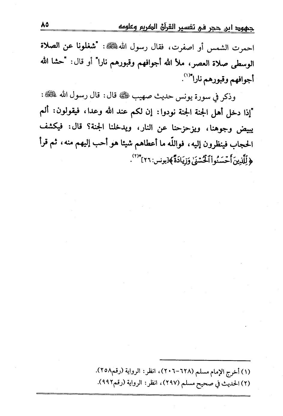 وذكر في سورة يونس حديث صهيب رضي الله عنه قال: قال رسول الله صلى الله عليه وسلم: "إذا دخل أهل الجنة الجنة نودوا: إن لكم عند الله وعدا، فيقولون: ألم يبيض وجوهنا، ويزحزحنا عن النار، ويدخلنا الجنة؟ قال: فيكشف الحجاب فينظرون إليه، فوالله ما أعطاهم شيئا هو أحب إليهم منه"، ثم قرأ {لِلَّذِينَ أَحْسَنُوا الْحُسْنَى وَزِيَادَةٌ} [يونس: 26] "2.