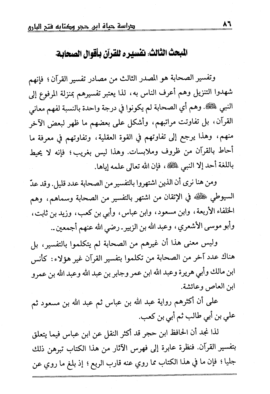 لذا نجد أن الحافظ ابن حجر قد أكثر النقل عن ابن عباس فيما يتعلق بتفسير القرآن. فنظرة عابرة إلى فهرس الآثار من هذا الكتاب تبرهن ذلك جليا؛ فإن ما في هذا الكتاب مما روي عنه قارب الربع؛ إذ بلغ ما روي عن