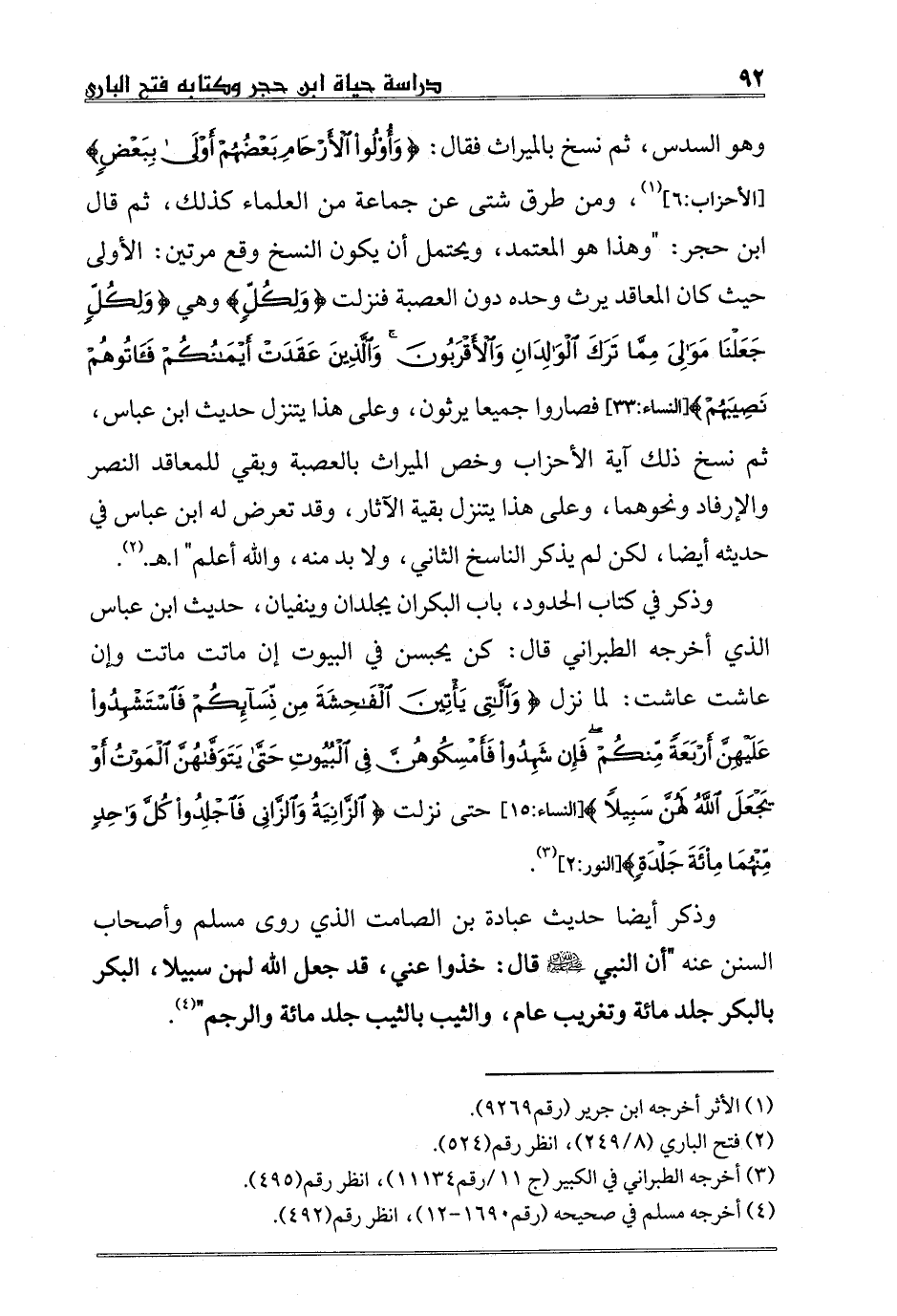 وذكر في كتاب الحدود، باب البكران يجلدان وينفيان، حديث ابن عباس الذي أخرجه الطبراني قال: كن يحبسن في البيوت إن ماتت ماتت وإن عاشت عاشت: لما نزل {وَاللَّاتِي يَأْتِينَ الْفَاحِشَةَ مِنْ نِسَائِكُمْ فَاسْتَشْهِدُوا عَلَيْهِنَّ أَرْبَعَةً مِنْكُمْ فَإِنْ شَهِدُوا فَأَمْسِكُوهُنَّ فِي الْبُيُوتِ حَتَّى يَتَوَفَّاهُنَّ الْمَوْتُ أَوْ يَجْعَلَ اللَّهُ لَهُنَّ سَبِيلاً} [النساء:15] حتى نزلت {الزَّانِيَةُ وَالزَّانِي فَاجْلِدُوا كُلَّ وَاحِدٍ مِنْهُمَا مِائَةَ جَلْدَةٍ} [النور:2] 3.