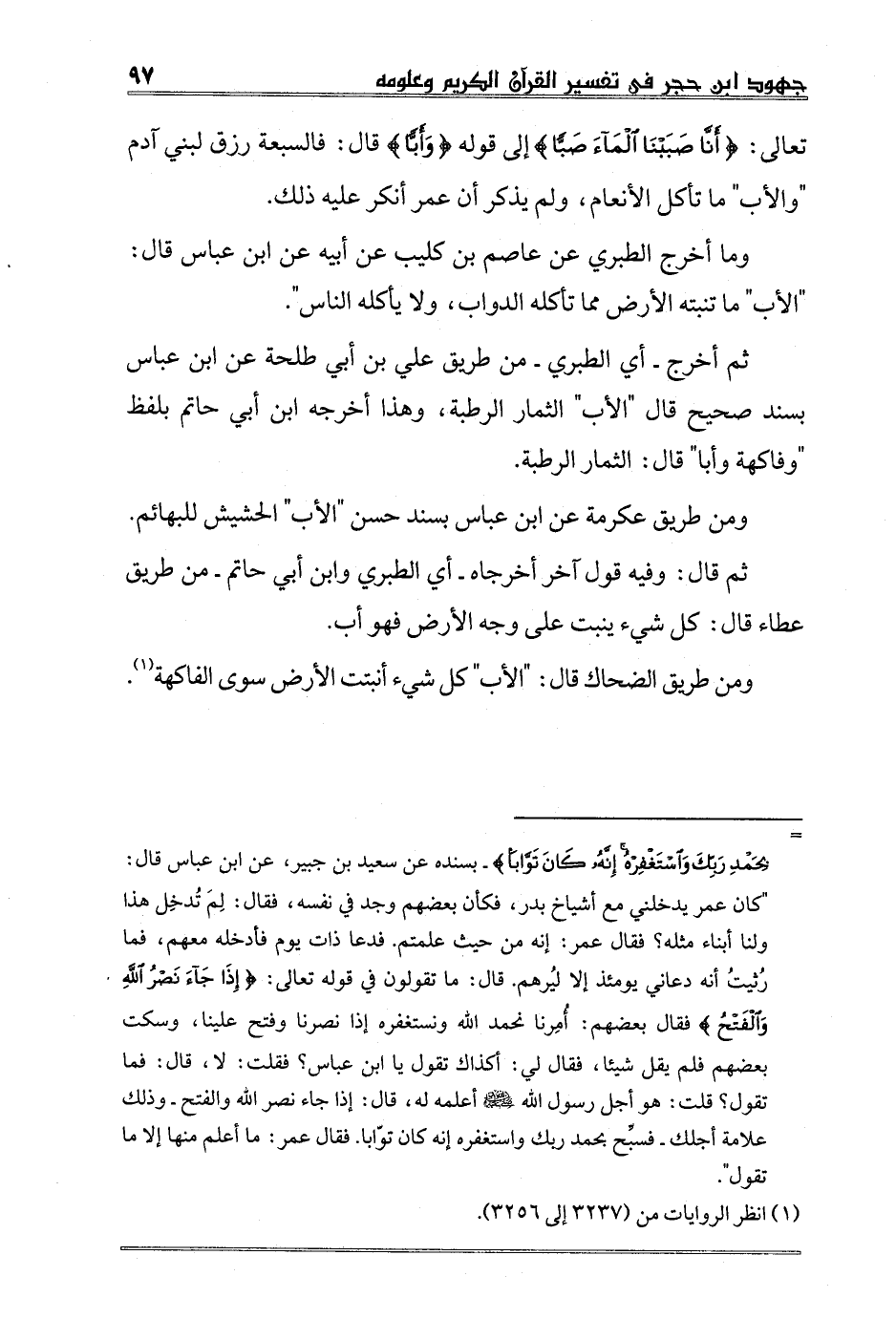 ثم أخرج - أي الطبري - من طريق علي بن أبي طلحة عن ابن عباس بسند صحيح قال "الأب" الثمار الرطبة، وهذا أخرجه ابن أبي حاتم بلفظ "وفاكهة وأبا" قال: الثمار الرطبة.