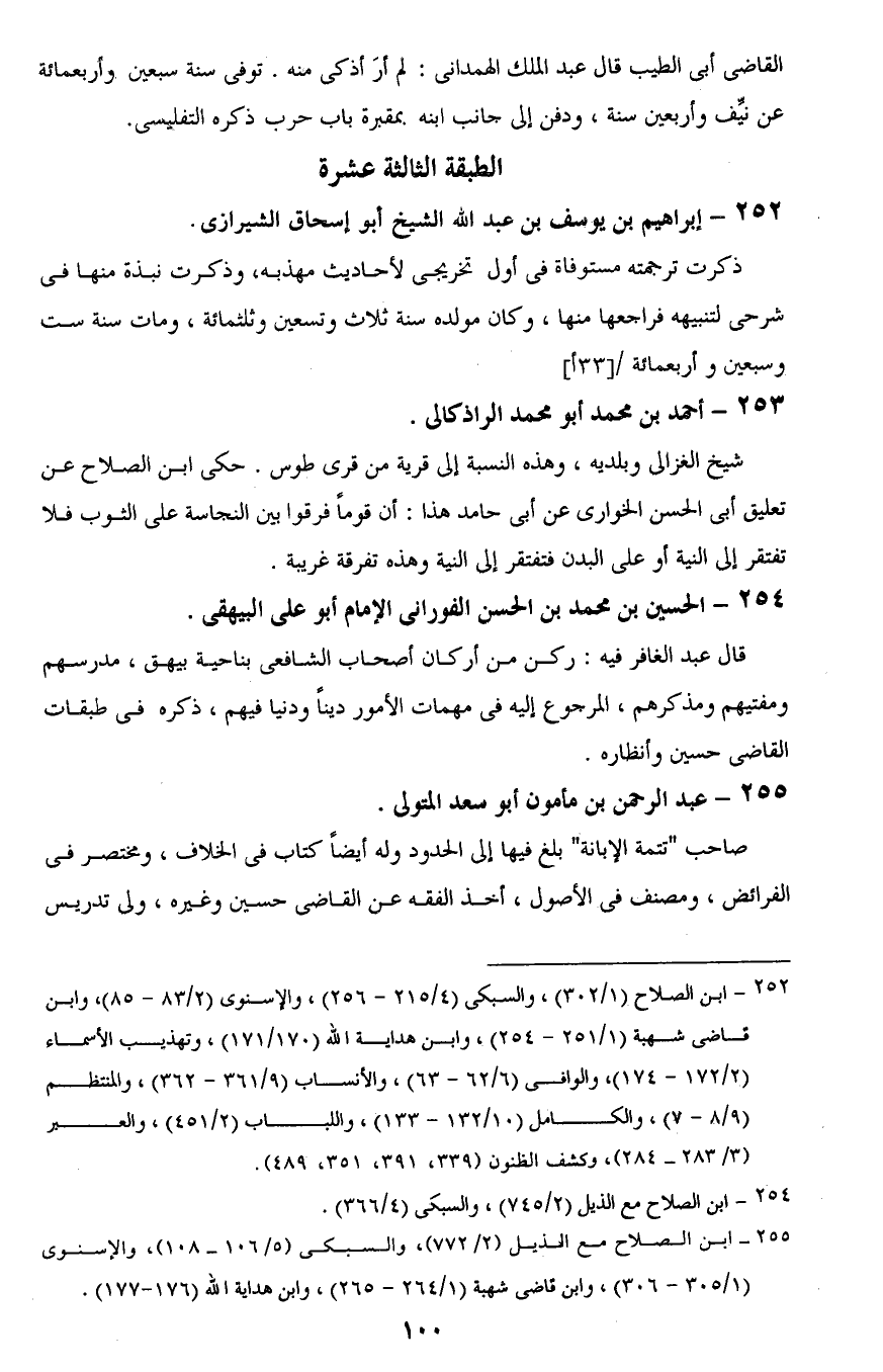 252 - ابن الصلاح (1/ 302)، والسبكى (4/ 215 - 256)، والإسنوى (2/ 83 - 85)، وابن قاضى شهبة (1/ 251 - 254)، وابن هداية اللَّه (170/ 171)، وتهذيب الأسماء (2/ 172 - 174)، والوافى (6/ 62 - 63)، والأنساب (9/ 361 - 362)، والمنتظم (9/ 8 - 7)، والكامل (10/ 132 - 133)، واللباب (2/ 451)، والعبر (3/ 283 - 284)، وكشف الظنون (339، 391، 351، 489).