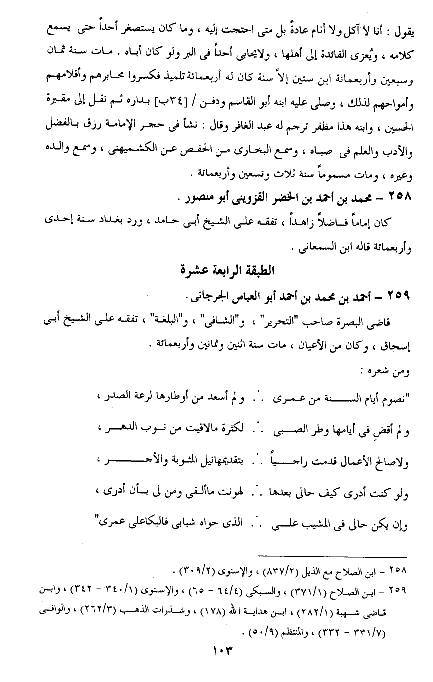 259 - ابن الصلاح (1/ 371)، والسبكى (4/ 64 - 65)، والإسنوى (1/ 340 - 342)، وابن قاضى شهبة (1/ 282)، ابن هداية اللَّه (178)، وشذرات الذهب (3/ 262)، والوافى (7/ 331 - 332)، والمنتظم (9/ 50).