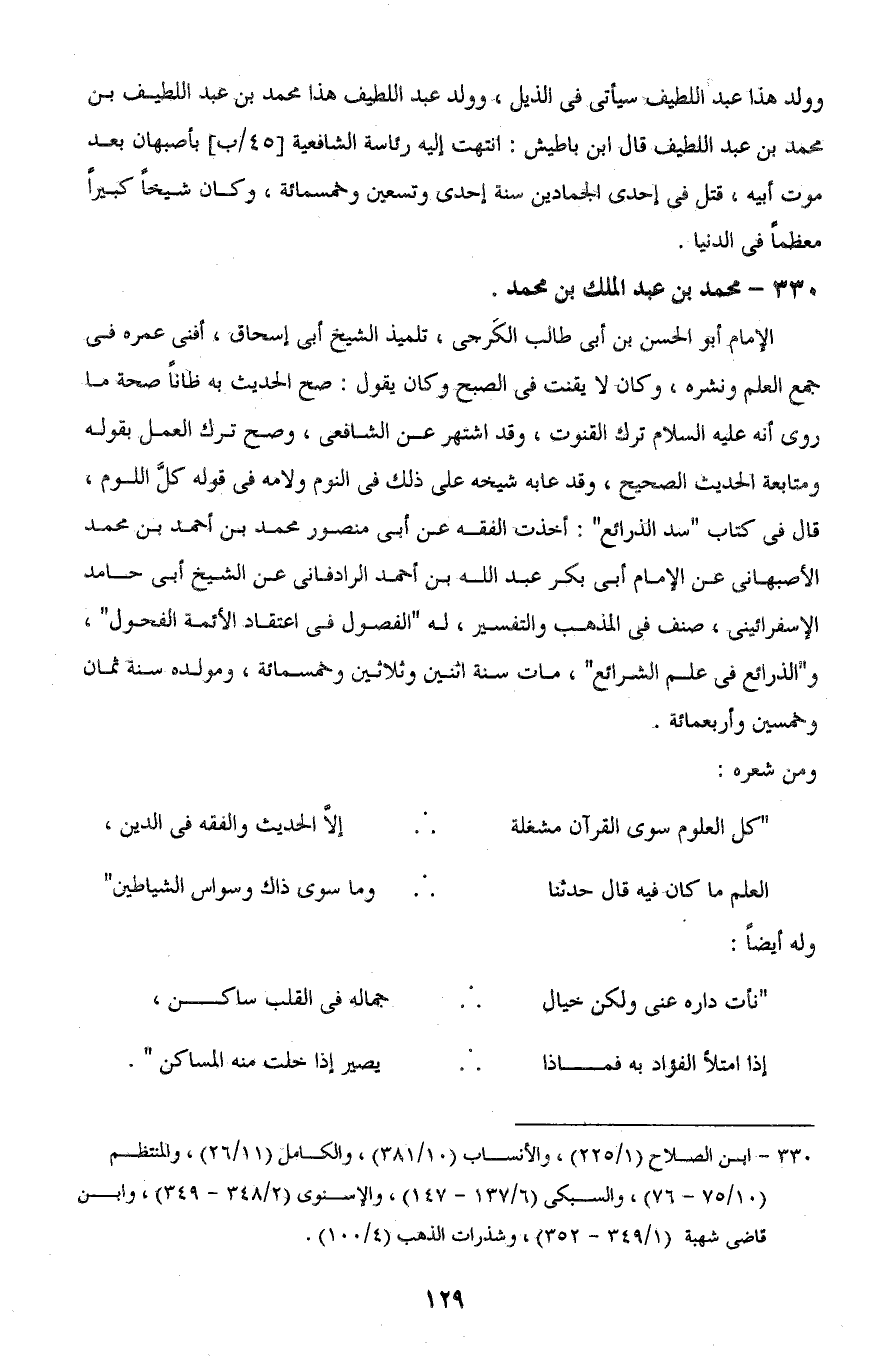 330 - ابن الصلاح (1/ 225)، والأنساب (10/ 381)، والكامل (11/ 26)، والمنتظم (10/ 75 - 76)، والسبكى (6/ 137 - 147)، والإسنوى (2/ 348 - 349) , وابن قاضى شهبة (1/ 349 - 352)، وشذرات الذهب (4/ 100).
