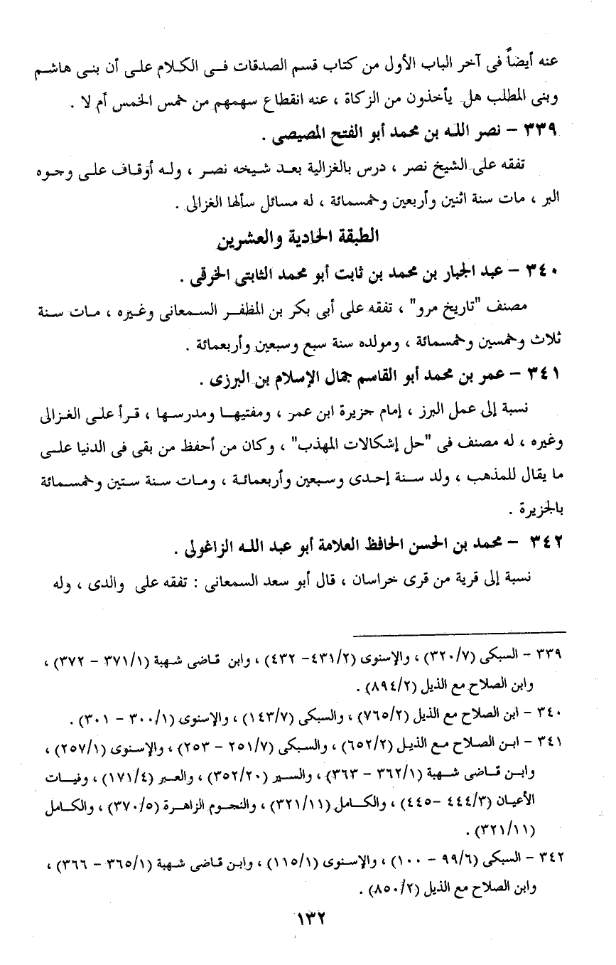 341 - ابن الصلاح مع الذيل (2/ 652)، والسبكى (7/ 251 - 253) والإسنوى (1/ 257)، وابن قاضى شهبة (1/ 362 - 363)، والسير (20/ 352)، والعبر (4/ 171)، وفيات الأعيان (3/ 444 - 445)، والكامل (11/ 321) والنجوم الزاهرة (5/ 370)، والكامل (11/ 321).