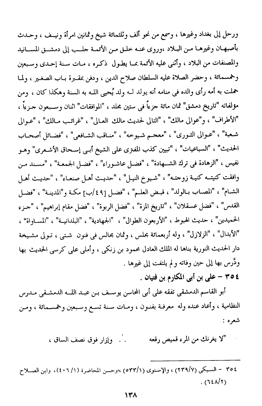 ورحل إلى بغداد وغيرها، وسمع من نحو ألف وثلثمائة شيخ وثمانين امرأة ونيف، وحدث بأصبهان وغيرها من البلاد، وروى عنه خلق من الأئمة جلب إلى دمشق المسانيد والمصنفات من البلاد، وأثنى عليه الأئمة. مما يطول ذكره، مات سنة إحدى وسبعين وخمسمائة، وحضر الصلاة عليه السلطان صلاح الدين، ودفن بمقبرة باب الصغير، ولما حملت به أمه رأى والده في منامه أنه يولد له ولد يُحيى اللَّه به السنة وهكذا كان، ومن مؤلفاته "تاريخ دمشق" ثمان مائة جزءًا في ستين مجلد، "الموافقات" اثنان وسبعون جزءًا، "الأطراف"، و"عوالى مالك"، "التالى لحديث مالك العالى"، "غرائب مالك"، "عوالى شعبة"، "عوالى الثورى"، "معجم شيوخه"، "مناقب الشافعى"، "فضائل أصحاب الحديث"، "السباعيات"، "تبيين كذب المفترى على الشيخ أبى إسحاق الأشعرى" وهو نفيس، "الزهادة في ترك الشهادة"، "فضل عاشوراء"، "فضل الجمعة"، "مسند من وافقت كنيته كنية زوجته"، "شيوخ النيل"، "حديث أهل صنعاء"، "حديث أهل الشام"، "المصاب بالولد"، "قبض العلم"، "فضل مكة والمدينة"، "فضل القدس"، "فضل عسقلان"، "تاريخ المزة"، "فضل الربوة"، "فضل مقام إبراهيم"، "جزء الحميدين"، حديث الهبوط، "الأربعون الطوال"، "الجهادية"، "البلدانية"، "المساواة"، "الأبدال"، "الزلازل"، وله أربعمائة مجلس، وثمان مجالس في فنون شتى، تولى مشيخة دار الحديث النورية بناها له الملك العادل محمود بن زنكى، وأملى على كرسى الحديث بها ودَّرس بها إلى حين وفاته ولم يلتفت إلى غيرها.
