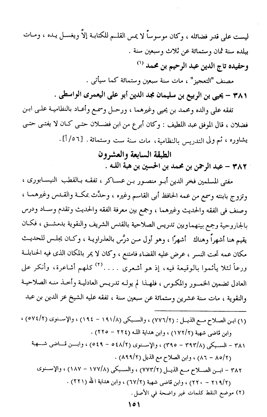 382 - ابن الصلاح مع الذيل (2/ 773)، والسبكى (8/ 177 - 187)، والإسنوى (2/ 219 - 220)، وابن قاضى شهبة (2/ 67)، وابن هداية الله (221).