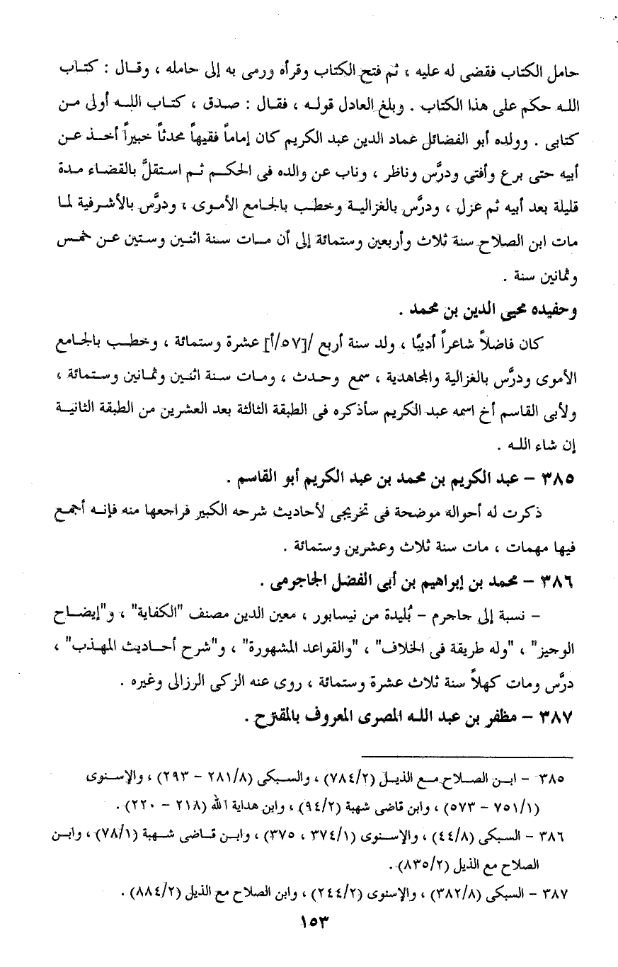 385 - ابن الصلاح مع الذيل (2/ 784)، والسبكى (8/ 281 - 293)، والإسنوى (1/ 751 - 573)، وابن قاضى شهبة (2/ 94)، وابن هداية اللَّه (218 - 220).