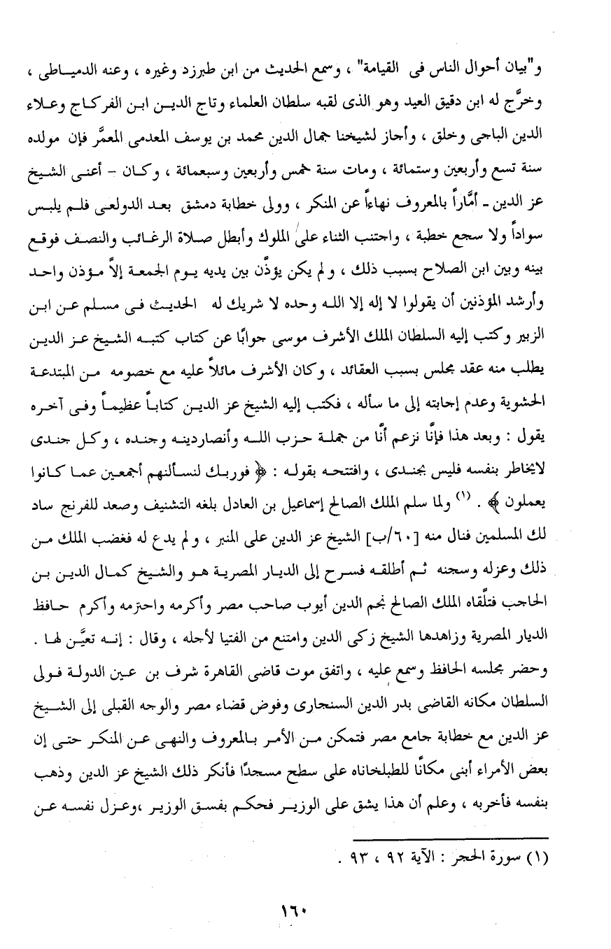 و"بيان أحوال الناس في القيامة"، وسمع الحديث من ابن طبرزد وغيره، وعنه الدمياطى، وخرَّج له ابن دقيق العيد وهو الذى لقبه سلطان العلماء وتاج الدين ابن الفركاج وعلاء الدين الباجى وخلق، وأجاز لشيخنا جمال الدين محمد بن يوسف المعدمى المعمَّر فإن مولده سنة تسع وأربعين وستمائة، ومات سنة خمس وأربعين وسبعمائة، وكان -أعنى الشيخ عز الدين- أمَّارًا بالمعروف نهاءًا عن المنكر، وولى خطابة دمشق بعد الدولعى فلم يلبس سوادًا ولا سجع خطبة، واجتنب الثناء على الملوك وأبطل صلاة الرغائب والنصف فوقع بينه وبين ابن الصلاح بسبب ذلك، ولم يكن يؤذن بين يديه يوم الجمعة إلا مؤذن واحد وأرشد المؤذنين أن يقولوا لا إله إلا اللَّه وحده لا شريك له الحديث في مسلم عن ابن الزبير وكتب إليه السلطان الملك الأشرف موسى جوابًا عن كتاب كتبه الشيخ عز الدين يطلب منه عقد مجلس بسبب العقائد، وكان الأشرف مائلًا عليه مع خصومه من المبتدعة الحشوية وعدم إجابته إلى ما سأله، فكتب إليه الشيخ عز الدين كتابًا عظيمًا وفى آخره يقول: وبعد هذا فإنَّا نزعم أنَّا من جملة حزب اللَّه وأنصار دينه وجنده، وكل جندى لا يخاطر بنفسه فليس بجندى، وافتتحه بقوله: {فَوَرَبِّكَ لَنَسْأَلَنَّهُمْ أَجْمَعِينَ عَمَّا كَانُوا يَعْمَلُونَ}. (¬1) ولما سلم الملك الصالح إسماعيل بن العادل بلغه التشنيف وصعد للفرنج ساد لك المسلمين فنال منه الشيخ عز الدين على المنبر، ولم يدع له فغضب الملك من ذلك وعزله وسجنه ثم أطلقه فسرح إلى الديار المصرية هو والشيخ كمال الدين بن الحاجب فتلَّقاه الملك الصالح نجم الدين أيوب صاحب مصر وأكرمه واحترمه وأكرم حافظ الديار المصرية وزاهدها الشيخ زكى الدين وامتنع من الفتيا لأجله، وقال: إنه تعيَّن لها. وحضر مجلسه الحافظ وسمع عليه، واتفق موت قاضى القاهرة شرف بن عين الدولة فولى السلطان مكانه القاضى بدر الدين السنجارى وفوض قضاء مصر والوجه القبلى إلى الشيخ عز الدين مع خطابة جامع مصر فتمكن من الأمر بالمعروف والنهى عن المنكر حتى إن بعض الأمراء أبنى مكانًا للطبلخاناه على سطح مسجدًا فأنكر ذلك الشيخ عز الدين وذهب بنفسه فأخربه، وعلم أن هذا يشق على الوزير فحكم بفسق الوزير، وعزل نفسه عن