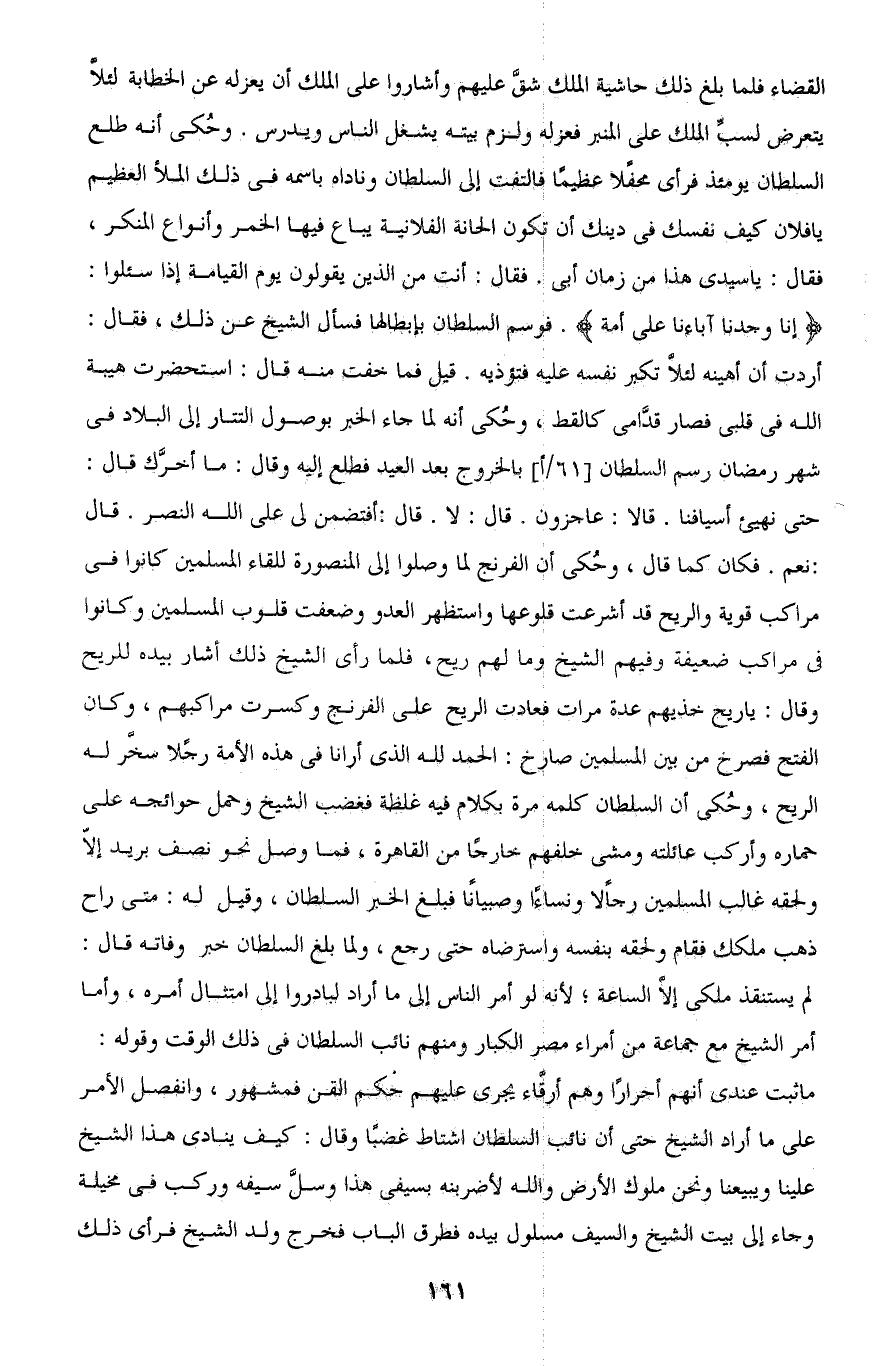 القضاء فلما بلغ ذلك حاشية الملك شقَّ عليهم وأشاروا على الملك أن يعزله عن الخطابة لئلَّا يتعرض لسبِّ الملك على المنبر فعزله ولزم بيته يشغل الناس ويدرس. وحُكى أنه طلع السلطان يومئذ فرأى محفلًا عظيمًا فالتفت إلى السلطان وناداه باسمه في ذلك الملأ العظيم يا فلان كيف نفسك في دينك أن تكون الحانة الفلانية يباع فيها الخمر وأنواع المنكر، فقال: يا سيدى هذا من زمان أبى. فقال: أنت من الذين يقولون يوم القيامة إذا سئلوا: {إِنَّا وَجَدْنَا آبَاءَنَا عَلَى أُمَّةٍ}. فوسم السلطان بإبطالها فسأل الشيخ عن ذلك، فقال: أردت أن أهينه لئلَّا تكبر نفسه عليه فتؤذيه. قيل فما خفت منه قال: استحضرت هيبة اللَّه في فلبى فصار قدَّامى كالقط، وحُكى أنه لما جاء الخبر بوصول التتار إلى البلاد في شهر رمضان رسم السلطان بالخروج بعد العيد فطلع إليه وقال: ما أخرَّك قال: حتى نهيئ أسيافنا. قالا: عاجزون. قال: لا. فال: أفتضمن لى على اللَّه النصر. قال: نعم. فكان كما قال، وحُكى أن الفرنج لما وصلوا إلى المنصورة للقاء المسلمين كانوا في مواكب قوية والريح قد أشرعت قلوعها واستظهر العدو وضعفت قلوب المسلمين وكانوا في مواكب ضعيفة وفيهم الشيخ وما لهم ويح، فلما رأى الشيخ ذلك أشار بيده للريح وقال: يا ريح خذيهم عدة مرات فعادت الريح على الفرنج وكسرت مراكبهم، وكان الفتح فصرخ من بين المسلمين صارخ: الحمد للَّه الذى أرانا في هذه الأمة رجلًا سخَّر له الريح، وحُكى أن السلطان كلمه مرة بكلام فيه غلظة فغضب الشيخ وحمل حوائجه على حماره وأركب عائلته ومشى خلفهم خارجًا من القاهرة، فما وصل نحو نصف بريد إلّا ولحقه غالب المسلمين رجالًا ونساءًا وصبيانًا فبلغ الخبر السلطان، وقيل له: متى راح ذهب ملكك فقام ولحقه بنفسه واسترضاه حتى رجع، ولما بلغ السلطان خبر وفاته قال: لم يستنقذ ملكى إلَّا الساعة؛ لأنه لو أمر الناس إلى ما أراد لبادروا إلى امتثال أمره، وأما أمر الشيخ مع جماعة من أمراء مصر الكبار ومنهم نائب السلطان في ذلك الوقت وقوله: ما ثبت عندى أنهم أحرارًا وهم أرقَّاء يجرى عليهم حكم القن فمشور، وانفصل الأمر على ما أراد الشيخ حتى أن نائب السلطان اشتاط غضبًا وقال: كيف ينادى هذا الشيخ علينا ويبيعنا ونحن ملوك الأرض والله لأضربنه بسيفى هذا وسلَّ سيفه وركب في مخيلة وجاء إلى بيت الشيخ والسيف مسلول بيده فطرق الباب فخرج ولد الشيخ فرأى ذلك